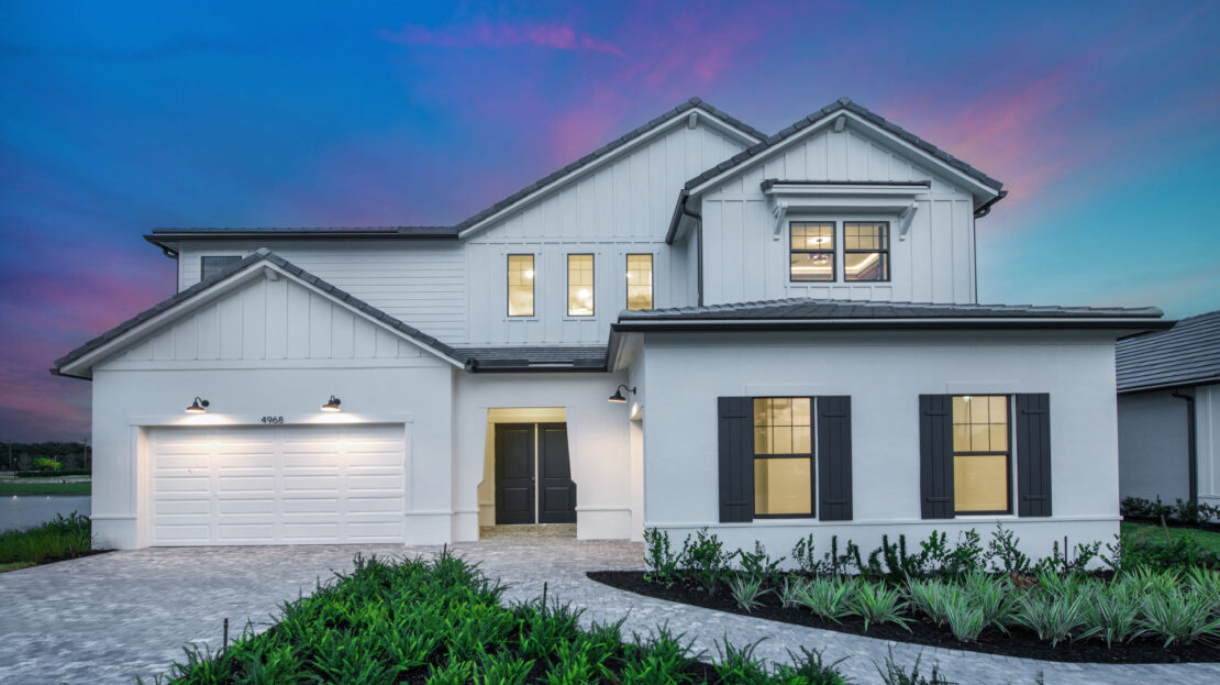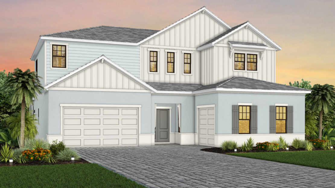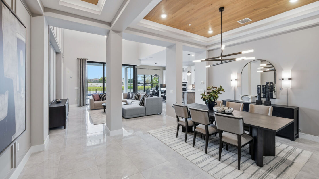 The Livingston II boasts a thoughtfully designed floorplan, perfectly balancing formal and casual spaces. Step inside to an inviting foyer that leads to a sweeping open-concept living area, ideal for entertaining guests or enjoying quiet family moments. The gourmet kitchen serves as the heart of the home, complete with modern appliances, expansive countertops, and ample storage. Adjacent dining and living spaces flow seamlessly to a covered lanai, accessible through double doors from the owner’s suite, perfect for outdoor gatherings or serene relaxation.