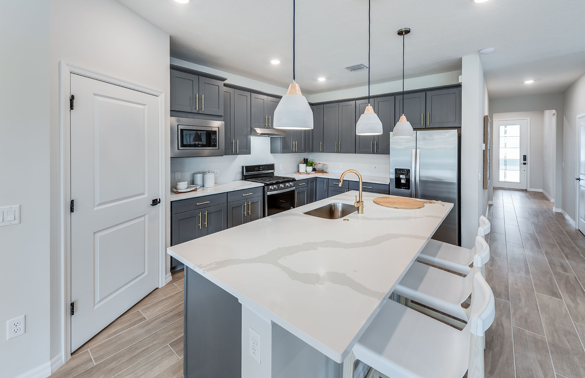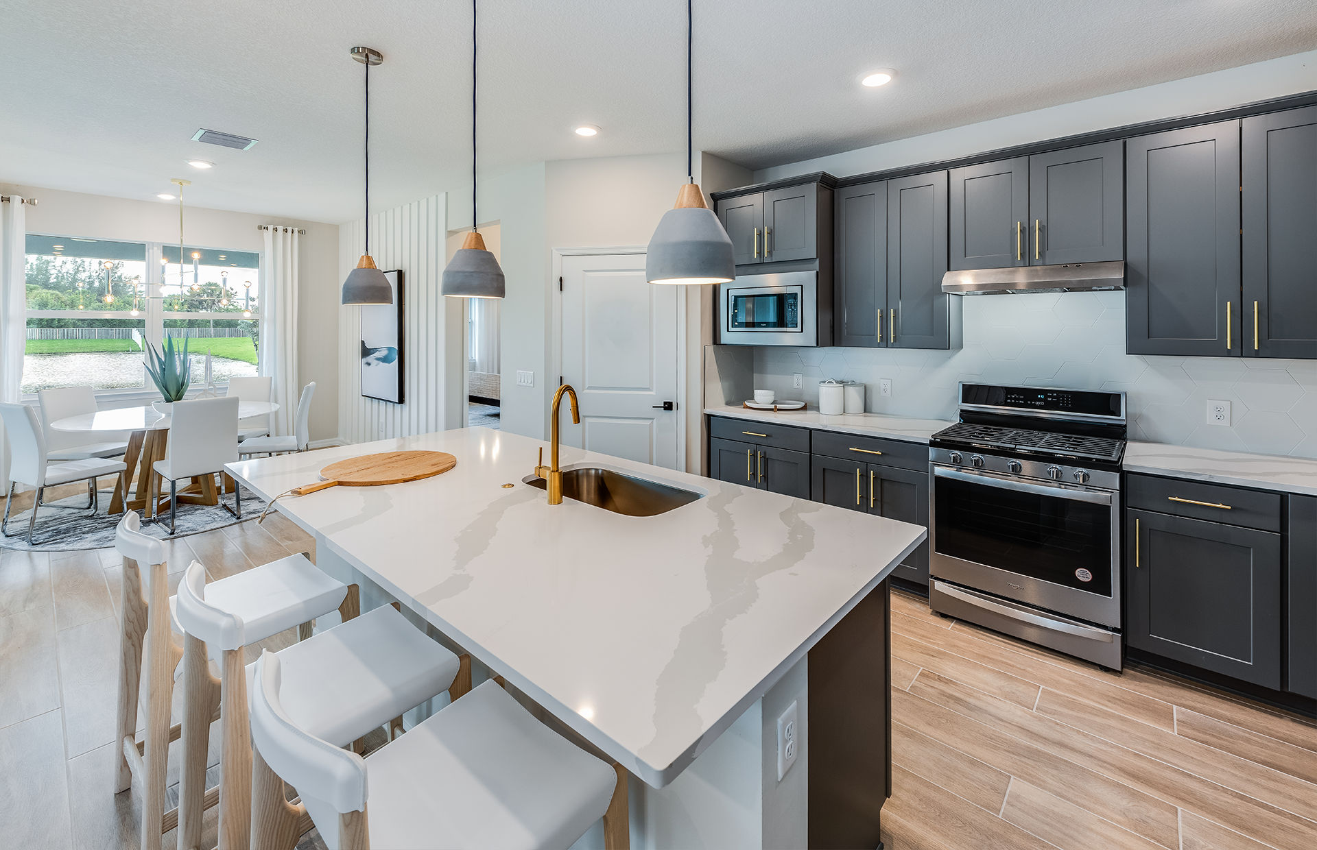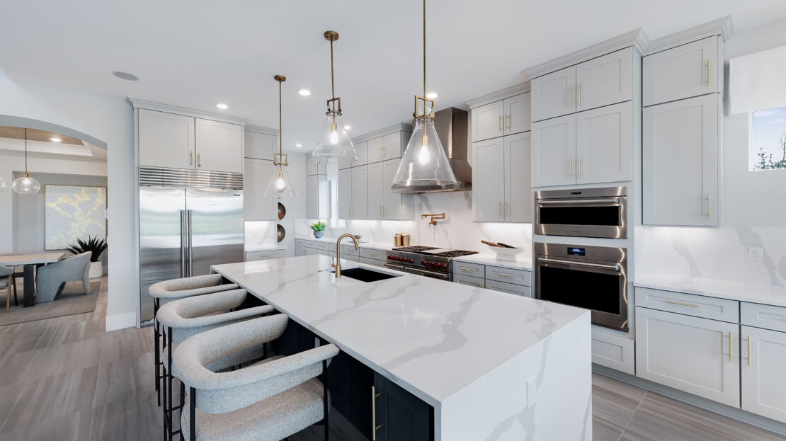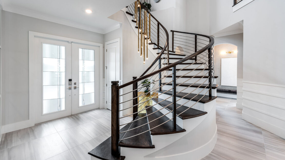 One of the home’s most striking features is its dramatic winding staircase, which sets a sophisticated tone as soon as you enter. The open-concept layout seamlessly connects the main living spaces, creating the perfect environment for both everyday living and large-scale entertaining. At the heart of the home is a chef-inspired pro-style kitchen designed to impress culinary enthusiasts. With generous workspace, premium finishes, and effortless flow into the gathering areas, it becomes the natural hub for hosting friends and family.