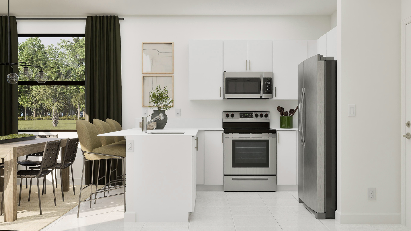 Step inside the Ashford and discover a welcoming first level that embodies the essence of open-concept living. The family room, kitchen, and dining area flow seamlessly together, creating a spacious and airy atmosphere ideal for entertaining or everyday family life. Natural light pours in through sliding glass doors, which also provide effortless access to outdoor living spaces, perfect for al fresco dining, social gatherings, or simply enjoying Miami’s beautiful weather. The kitchen is designed for both functionality and style, with modern finishes, ample storage, and a layout that makes cooking a pleasure.