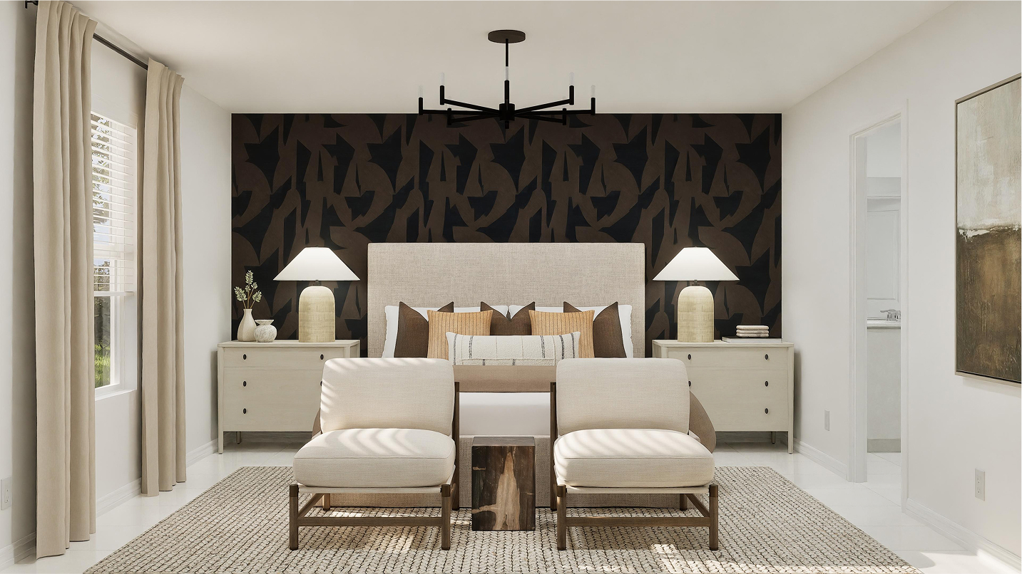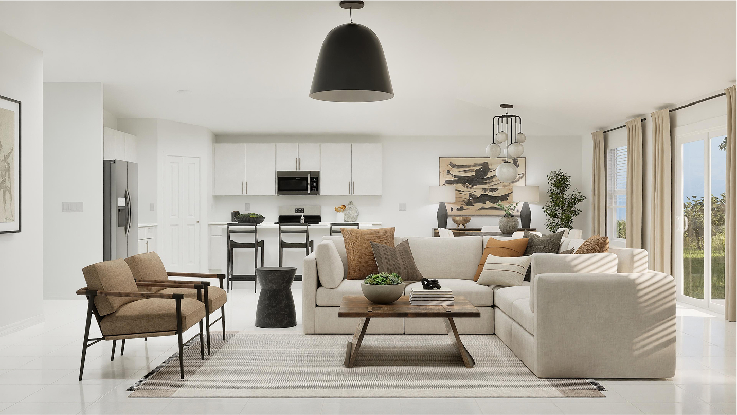 The open living area serves as the centerpiece of the Bravo, combining a modern kitchen, cozy dining area, and spacious family room. This space is perfect for entertaining, casual family gatherings, or simply relaxing in style. Large windows and thoughtfully placed design elements allow natural light to fill the rooms, enhancing the warm and inviting atmosphere. The family room extends to a patio, creating a seamless indoor-outdoor living experience that is perfect for Miami’s sunny climate.