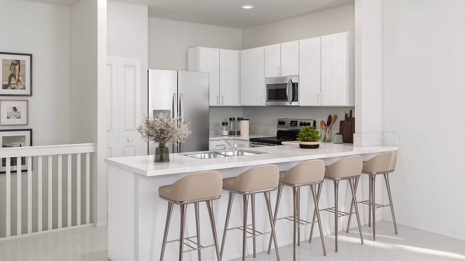The Atrium’s main level is designed with an open-concept layout that creates a seamless flow between the kitchen, dining, and living areas. The U-shaped kitchen serves as the heart of the home, complete with modern finishes and ample counter space, ideal for cooking, entertaining, and everyday living. It opens directly to a spacious Great Room and a cozy dining area, allowing natural light to fill the space and creating a welcoming atmosphere for family gatherings and social occasions.