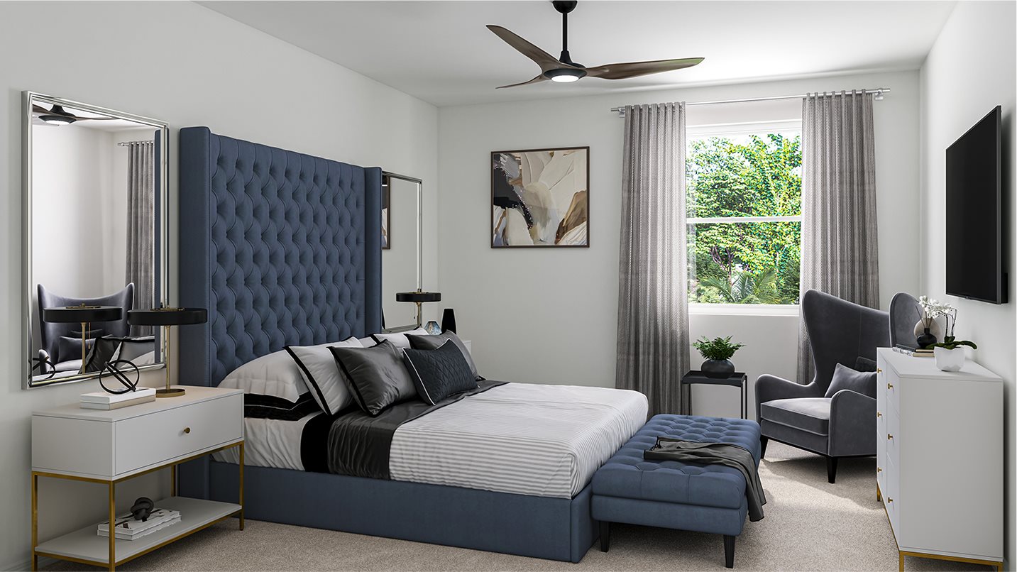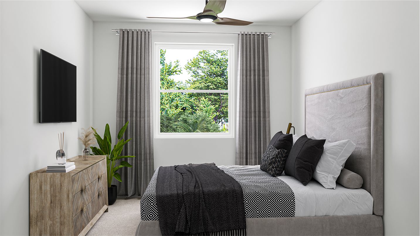 Spanning 1,286 square feet, the Citadelle features three bedrooms and two bathrooms, providing ample space for family life and entertaining. This home’s open-concept layout is a highlight, creating a seamless flow between the U-shaped kitchen, the spacious Great Room, and the intimate dining area. The kitchen, with its modern design and functional layout, serves as the heart of the home, perfect for cooking, gatherings, and everyday living. Impact-resistant windows throughout the home ensure both safety and abundant natural light, enhancing the bright and airy atmosphere of the main living spaces.
