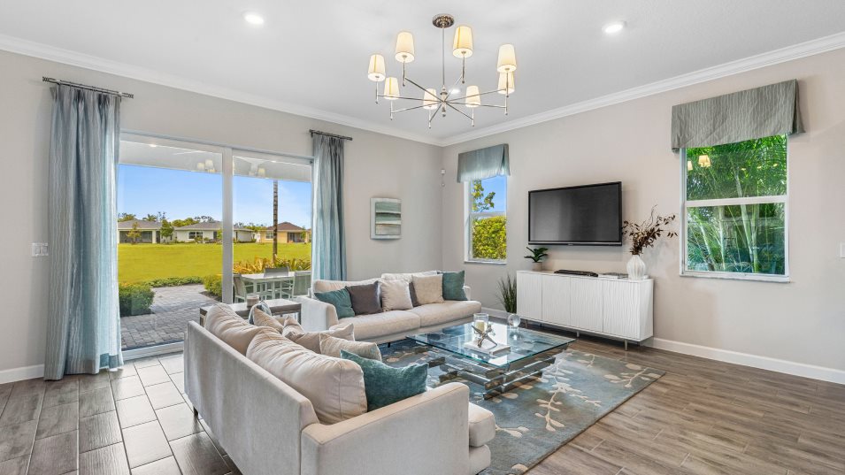 Exclusive to active adults 55+ and better! This luxurious single-story home includes three bedrooms, each with a private full bathroom, as well as a den. As the largest of these rooms, the owner’s suite also boasts a walk-in closet. The open-concept Great Room, is comfortably located between the covered patio, dining room and kitchen. A center island in the kitchen provides extra dining and counter space.