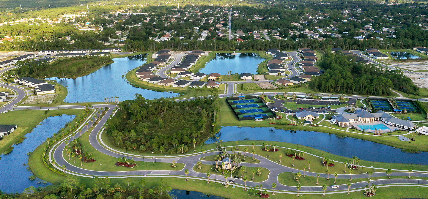 The Timbers at Everlands is a master-planned community offering low-maintenance villa and single-family homes exclusively for active adults 55+ in the Florida Space Coast area. Homeowners can enjoy recreation-rich living with a state-of-the-art clubhouse surrounded by a resort-style swimming pool, fishing lake, putting green, dog parks and sports courts to play tennis and pickleball. Palm Bay features numerous golf courses, parks and natural gems like the St. Johns River, making it easy for residents to get outdoors and stay active. In the surrounding area are great water-borne destinations such as Port Canaveral, Cocoa Beach and Melbourne Beach for endless fun in the sun.