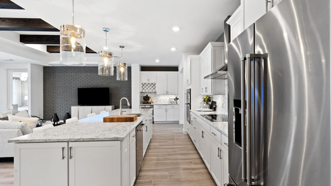 The heart of the home is the entertainer’s dream gathering room, seamlessly connected to the gourmet kitchen. Featuring an oversized island, stainless steel appliances, and a walk-in pantry, the kitchen is both stylish and practical. Indoor-outdoor living is emphasized with versatile spaces that allow for effortless entertaining and everyday family enjoyment. Large windows and sliding doors invite natural light, creating a bright, welcoming atmosphere throughout the home.