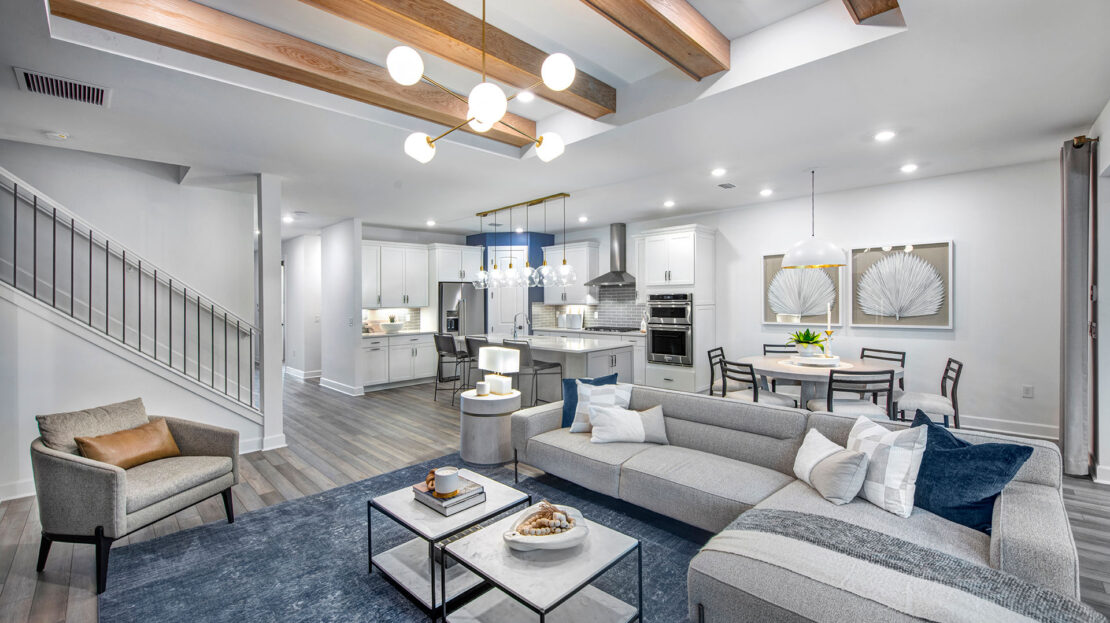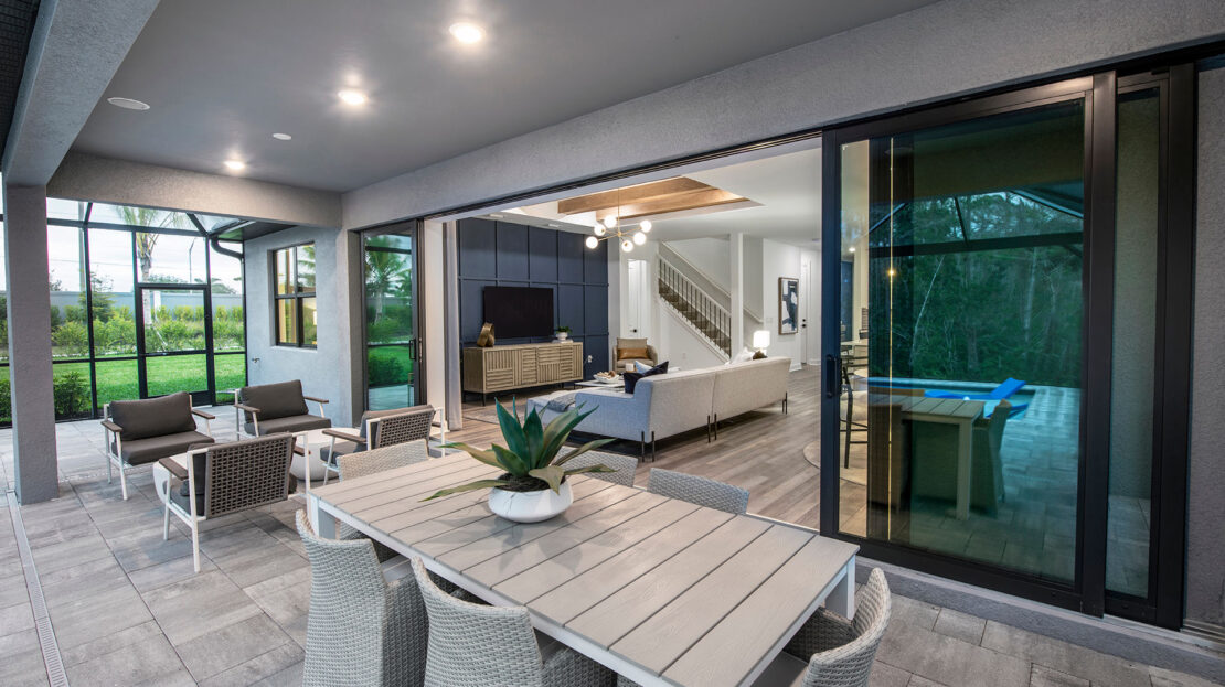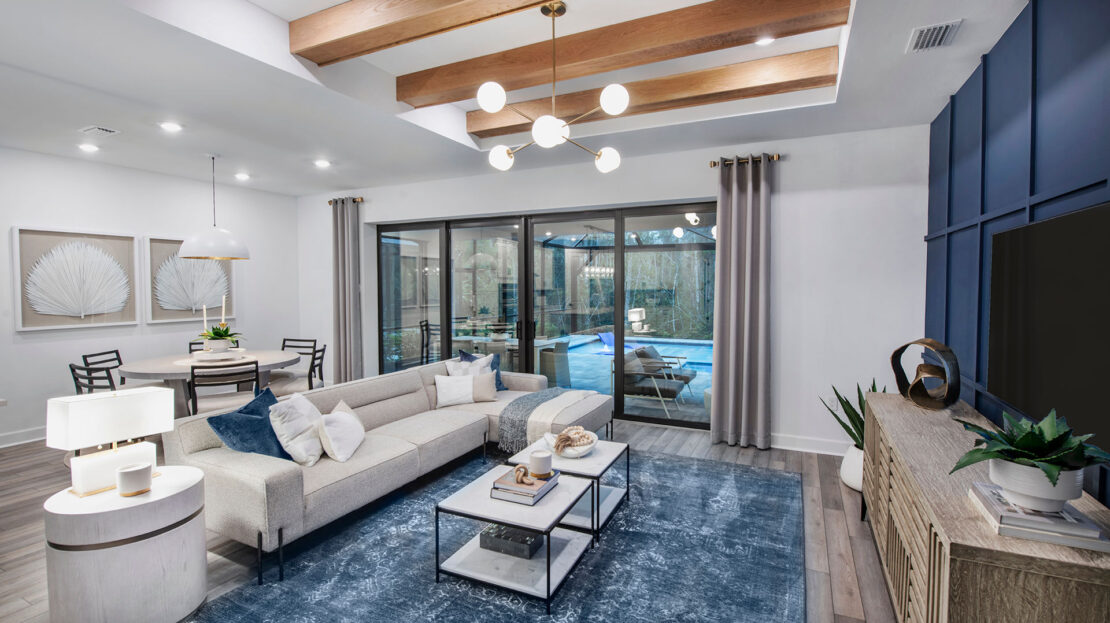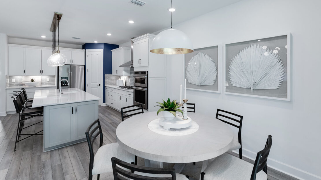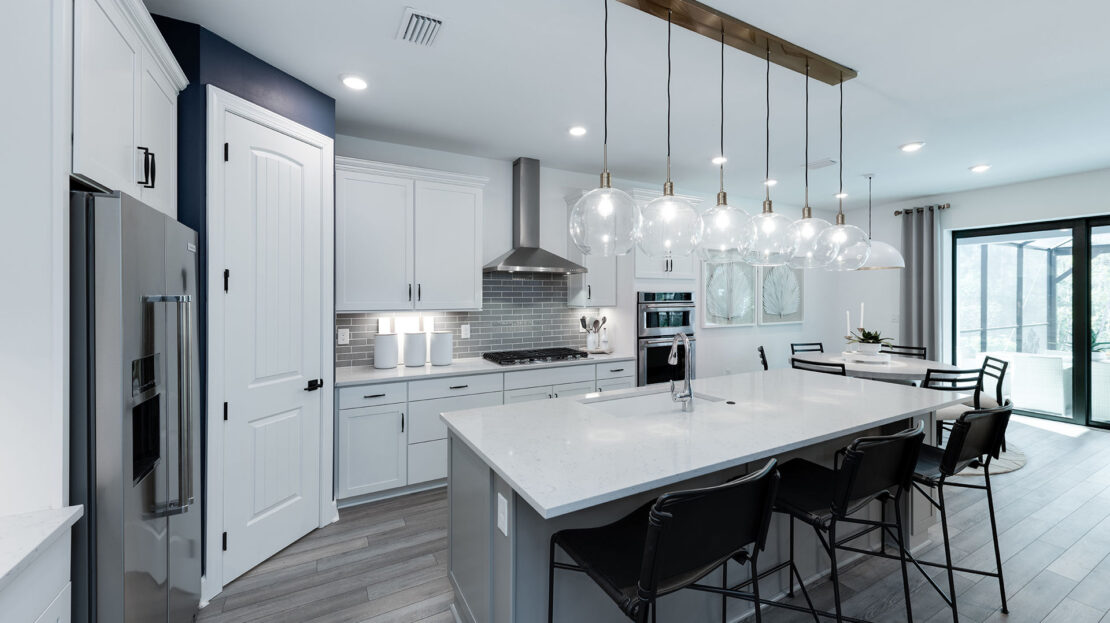 The heart of the Whitestone is the gathering room, where optional pocket sliding doors create a seamless transition between indoor and outdoor living—perfect for entertaining or enjoying Florida’s sunshine. The open-concept design flows effortlessly into the kitchen and dining areas, offering a versatile space that meets both daily living and special occasion needs.