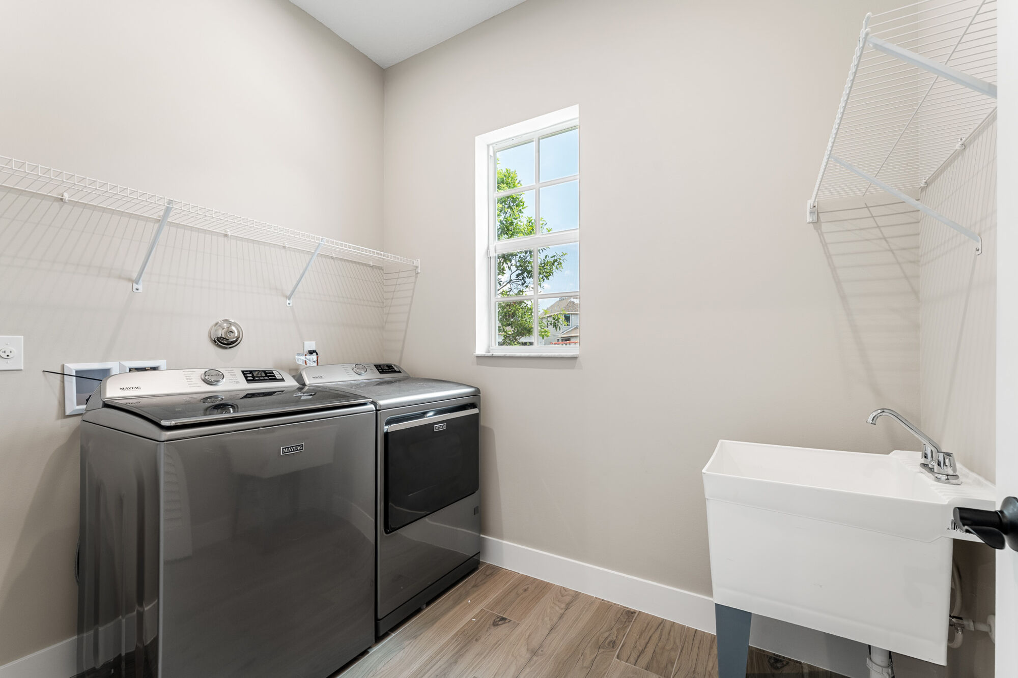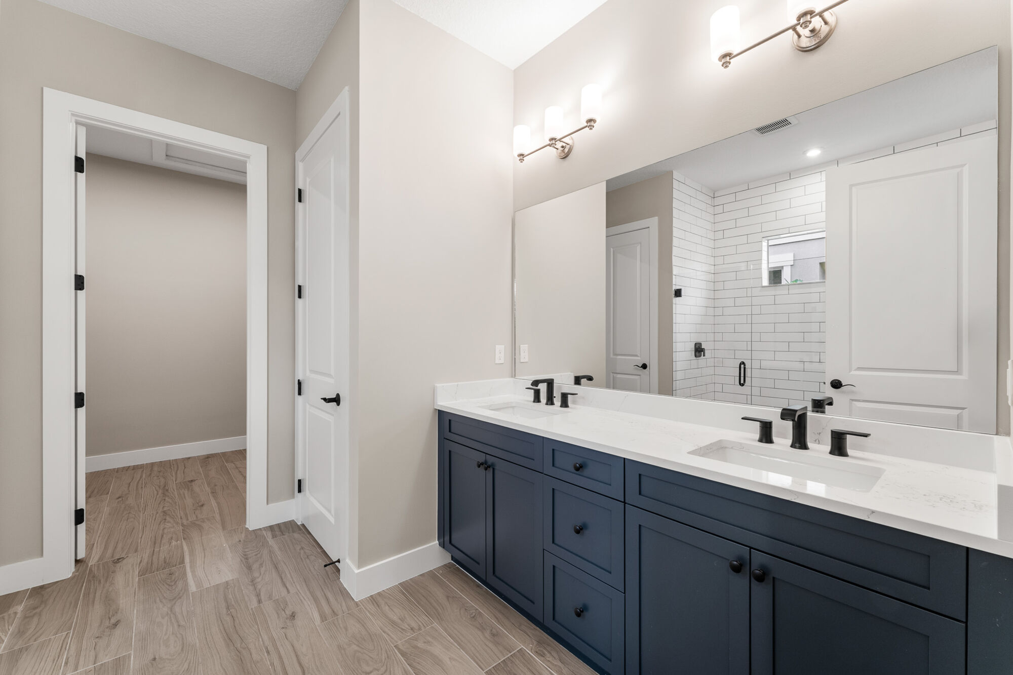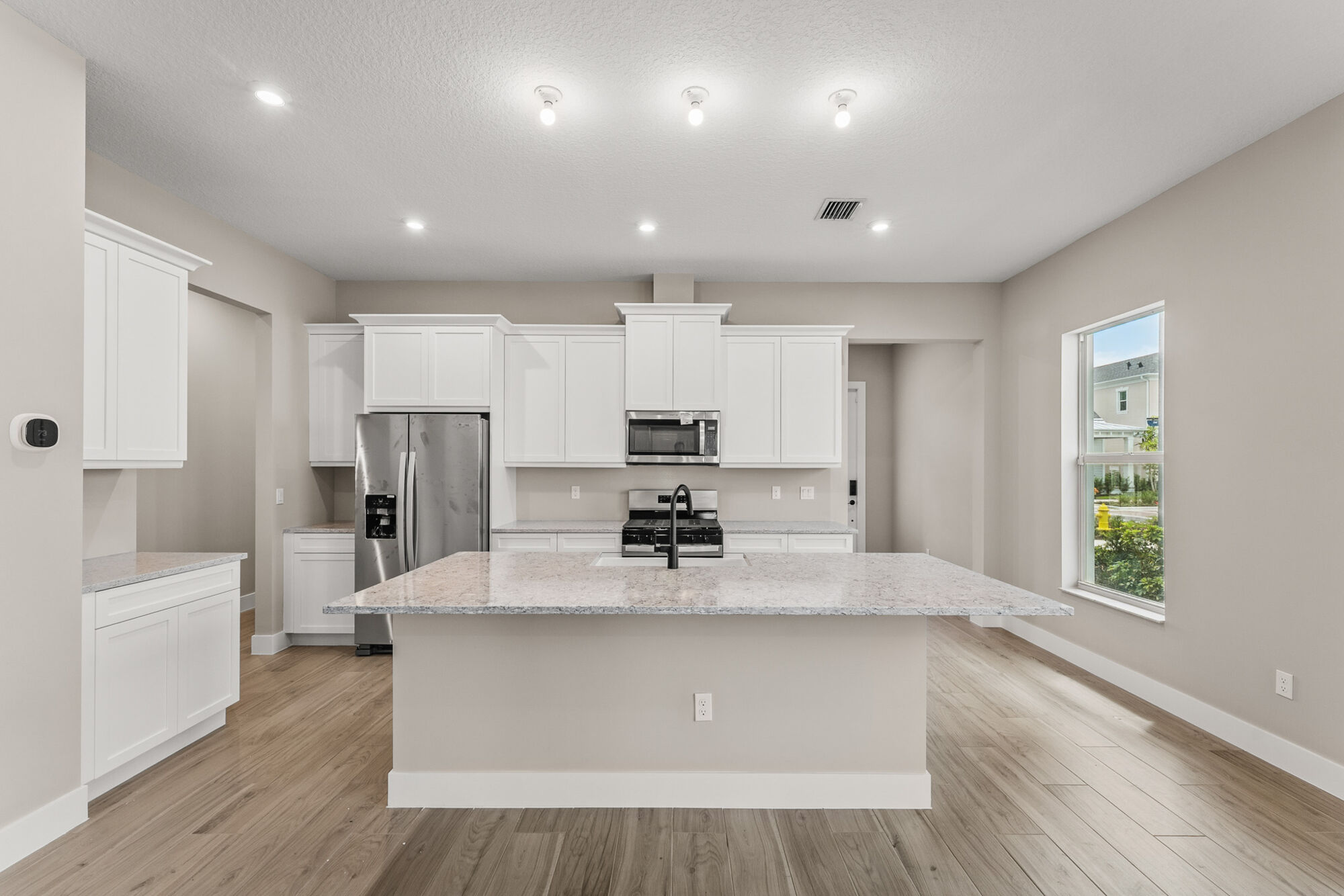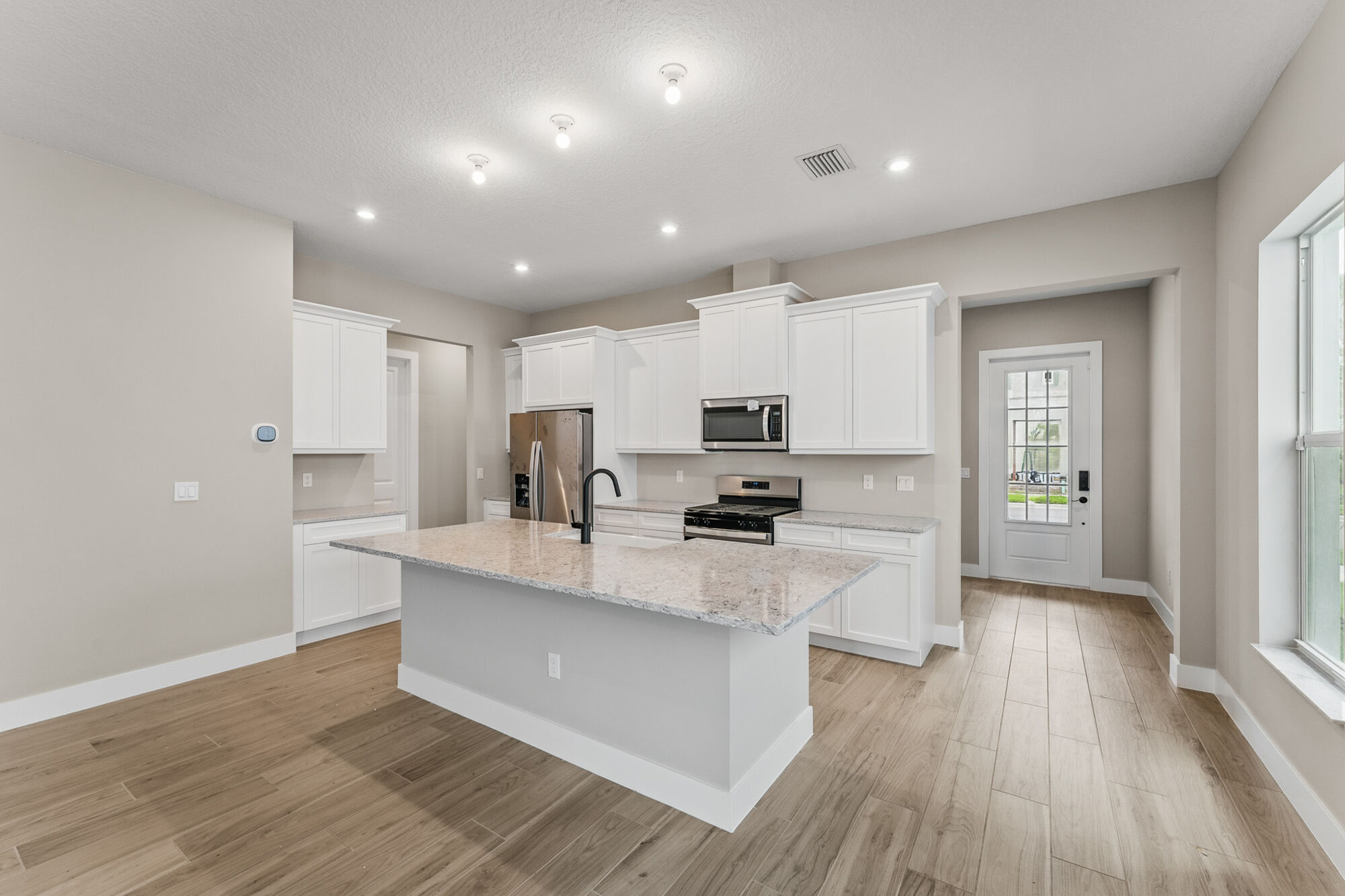 The kitchen is designed for both style and efficiency, offering ample counter space, modern cabinetry, and an intuitive layout that makes cooking and entertaining effortless. Adjacent to the kitchen, the dining and living areas are flooded with natural light, enhancing the home’s bright and airy feel. Each bedroom is thoughtfully placed to maximize comfort and privacy, with the primary suite featuring a luxurious bathroom retreat.