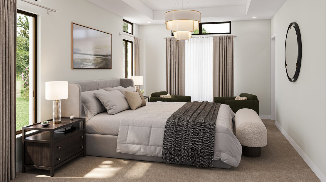The Astoria showcases an open and inviting layout with five spacious bedrooms and four full bathrooms, thoughtfully arranged to provide both connection and privacy. Upon entering, guests are welcomed by a grand foyer that leads to a bright and airy interior. A secondary bedroom with its own full bath sits near the front of the home—ideal for guests, multigenerational living, or a private office space.