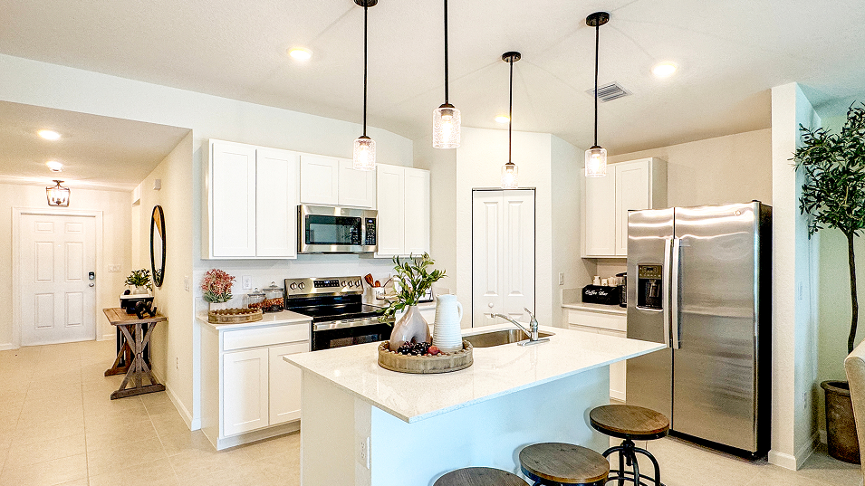 This new home design grants low-maintenance living and modern comfort on a convenient single story. Two versatile bedrooms and a versatile flex space frame the foyer, while further down the hallway is an open layout shared among the multifunctional kitchen, intimate dining space and welcoming family room. In a secluded corner is the tranquil owner’s suite complemented by an attached bathroom and walk-in closet.