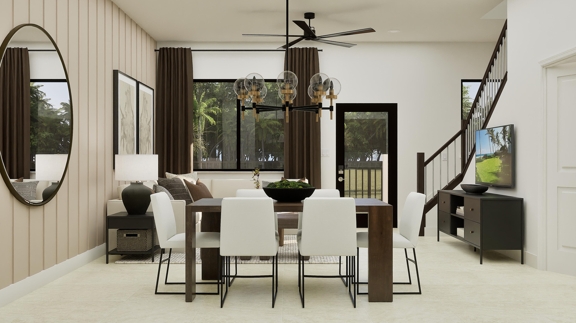 Inside, the open-concept main level sets the tone for effortless everyday living. The gourmet kitchen, complete with high-end finishes, a center island, and ample cabinetry, seamlessly flows into the Great Room and dining area. This spacious layout encourages connection, making it ideal for both relaxed nights in and lively gatherings with friends. Large windows fill the space with natural light, creating a bright and welcoming atmosphere that highlights the home’s modern design aesthetic.
