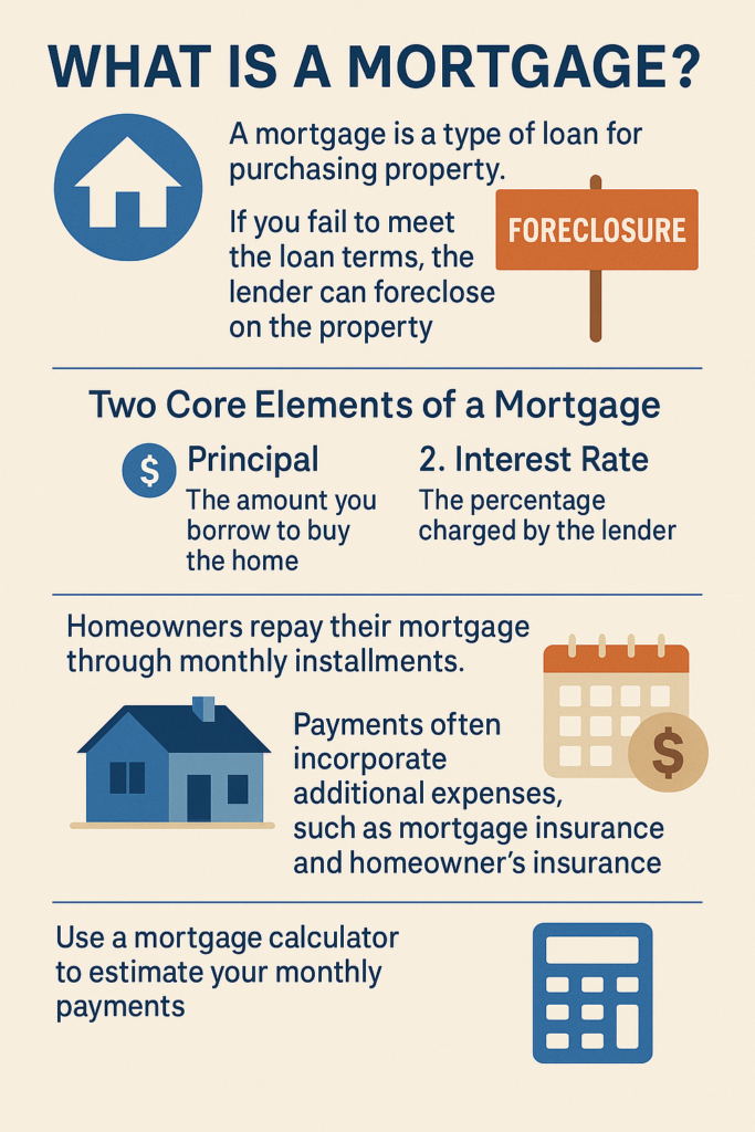 A mortgage is a type of loan used to purchase real estate. It allows homebuyers to borrow money from a lender (typically a bank, credit union, or mortgage company) to pay for a home. In exchange, the buyer agrees to repay the loan over time, usually with interest, through monthly payments.