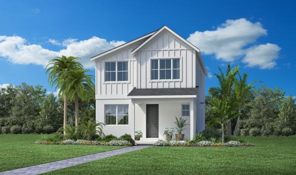 Stylish urban comfort. The Bellamy’s inviting porch and entry flow into the welcoming foyer and a bright flex room, revealing the spacious great room, dining room, and desirable covered lanai beyond. The well-equipped gourmet kitchen is highlighted by a large center island with breakfast bar, plenty of counter and cabinet space, and ample walk-in pantry. The serene primary bedroom suite is enhanced by an enormous walk-in closet and spa-like primary bath with dual-sink vanity, large luxe shower, and private water closet. Generous secondary bedrooms feature sizable closets and shared hall bath. Additional highlights include a convenient powder room, centrally located laundry, and additional storage.