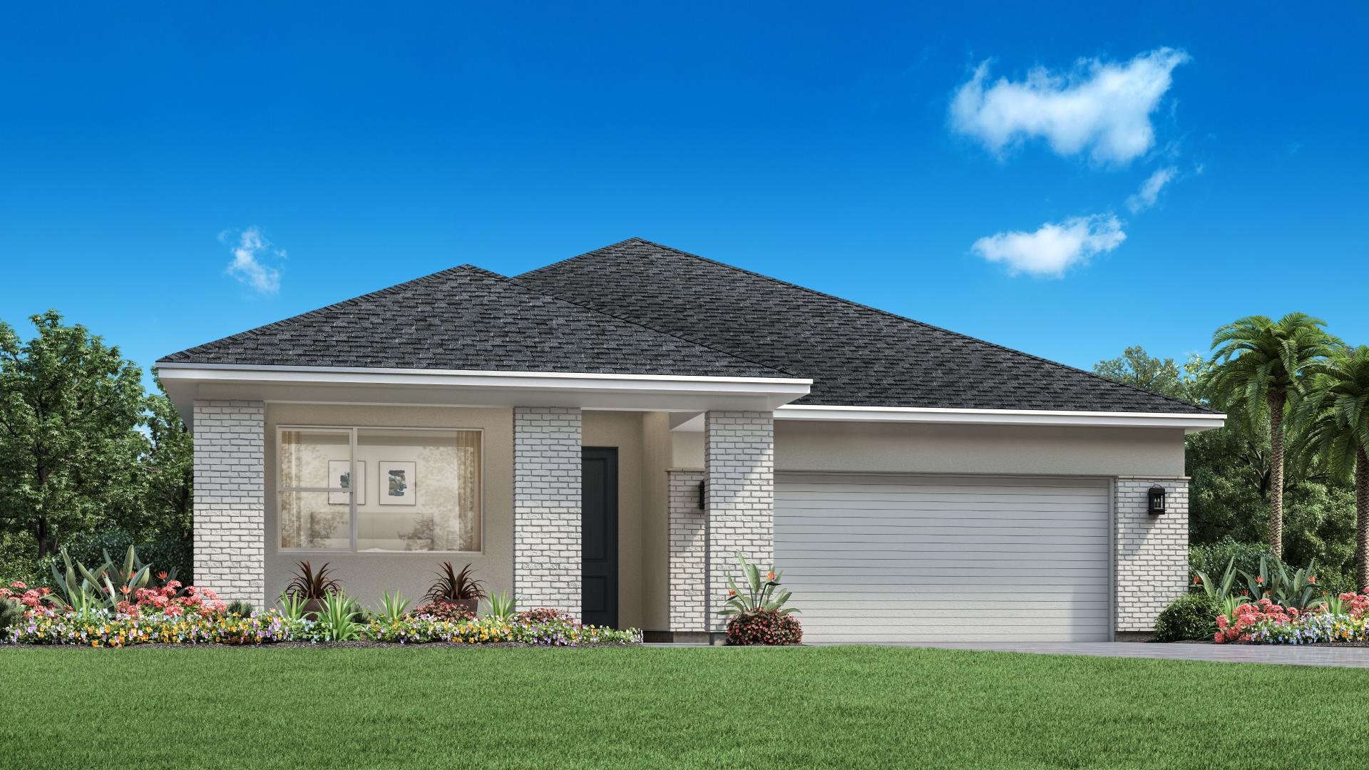Step into the Raymond Modern, a thoughtfully designed 3-bedroom, 2-bathroom home offering 1,839 square feet of open-concept living. This split floor plan places the two secondary bedrooms at the front of the home, while the private primary suite is tucked away in the back for added comfort. The heart of the home features a spacious living area with a multi-sliding glass door that opens to an extended lanai—perfect for indoor-outdoor entertaining. The primary bathroom offers a spa-like retreat with a large walk-in shower and freestanding pedestal tub. Additional highlights include a welcoming front porch, an elegant glass front door, and a 2-car garage, all wrapped in clean, modern style.
