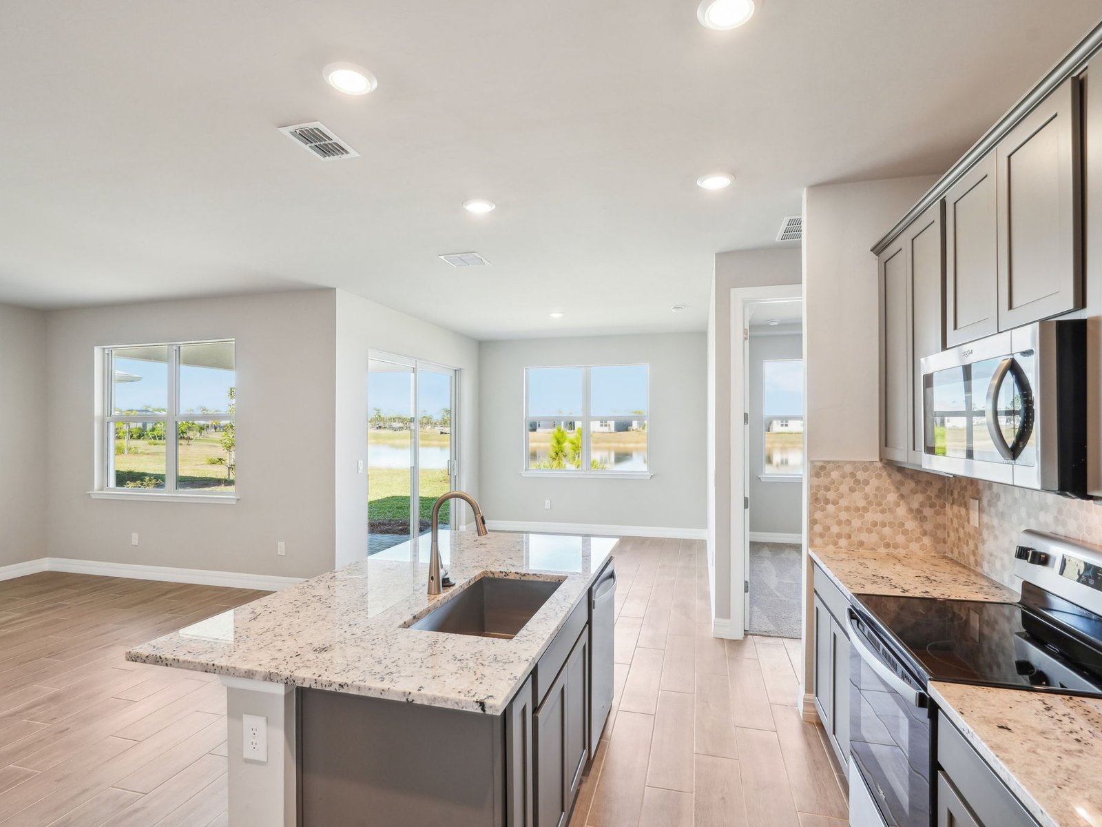 Enjoy cooking in the chef inspired kitchen overlooking the great room, dining nook and covered lanai. Tucked in the back for privacy, the primary suite is perfect place to retreat after a long day featuring a large walk-in closet and dual vanity sinks.