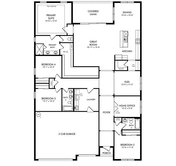 This spacious floorplan includes a large great room that overlooks the integrated covered lanai. The dining room is perfect for formally entertaining. The flex room with optional doors can be used for a private work area.
