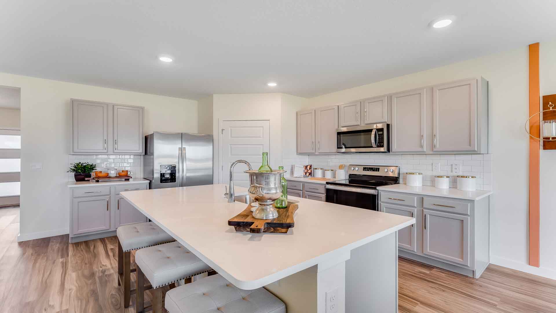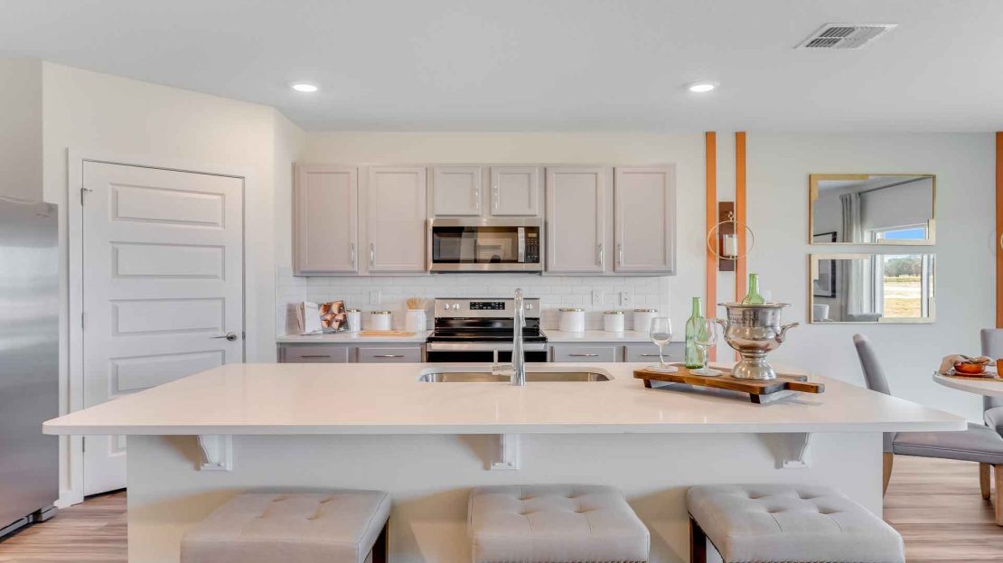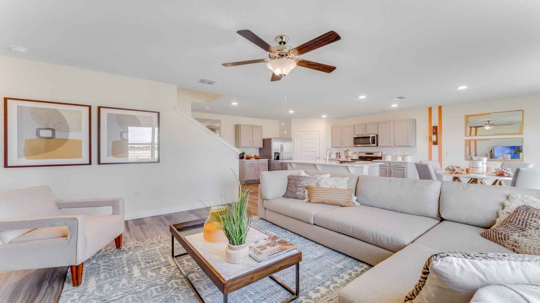 Find all the space you need in our popular two-story Hayden floorplan in Ironwood, one of our communities in Daytona Beach, Florida.Inside this 5-bedroom, 3-bathroom home, you’ll find 2,601 square feet of flexible living space and a two-car garage. Step thru the front foyer and you’re greeted with a flex room designed for work or play. Make your way to the kitchen on the first floor, which overlooks the living, dining room and slider to the backyard patio. The kitchen features a center island with room for seating, plentiful cabinetry, granite countertops, stainless steel appliances and a walk-in pantry which are sure to both turn heads and make meal prep easy. Guests can pull up a seat in this functional space.