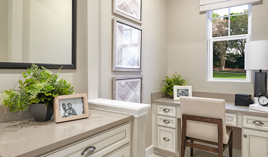 Ideal for entertaining, the Fraser’s open-concept layout features a large kitchen with a breakfast-bar island, flanked by a separate dining area and a great room with access to an inviting covered patio. You’ll also enjoy the convenience of a laundry room, plus a mud room with storage space—also available as a tech center—and an optional key drop. Two secondary bedrooms share access to a full hall bath, and a secluded master suite boasts a walk-in closet and private bath.