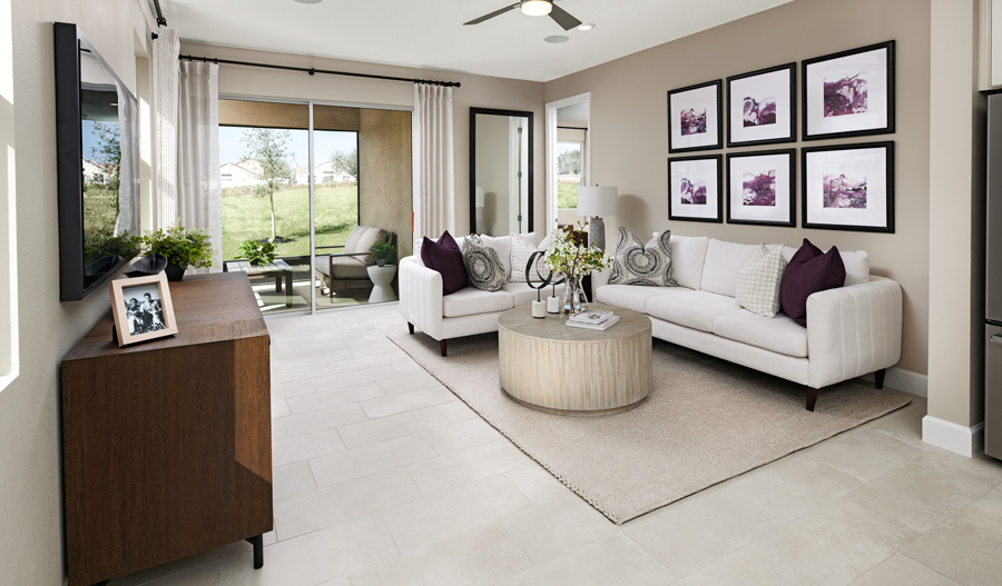 Fraser Model at Seasons at Shores of Lake Dell in Dundee Florida by homebuilder Richmond American Homes. This new 1 story home floorplan features 3 bedrooms, 2 bathrooms, 1700 sqft and 2 car garage. Fraser model pricing starts from $298950 a deal in this new Orlando community.