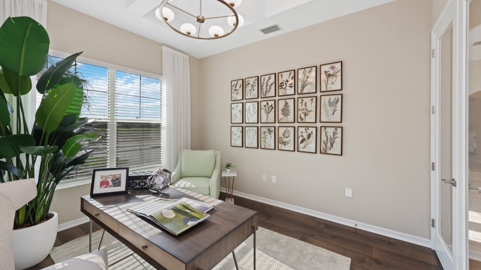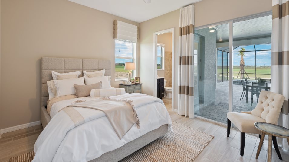 This luxe single-story home features a formal dining room off the foyer, followed by an open Great Room with elegant tray ceilings and glass sliders to the oversized covered lanai. In addition to the sprawling owner’s suite, there are two secondary bedrooms and a versatile den. For extra charm, there are tall, arched entryways that decorate the home. Palm Lake at Coco Bay is a master-planned community of new homes that seamlessly blends coastal living with modern comfort, now selling in Englewood, FL.