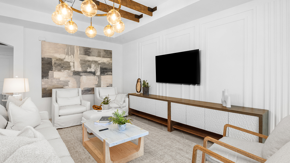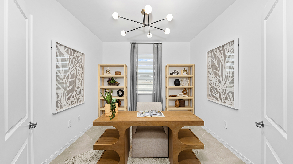 This spacious single-story home features an airy den off the foyer, followed by an open living space with access to a lanai for outdoor entertaining. In addition to the luxe owner’s suite, there is a secondary suite and a spare bedroom. A three-car garage offers extra storage or versatile needs.
