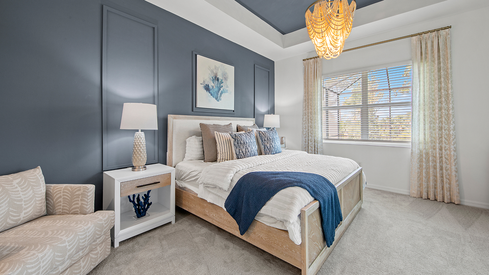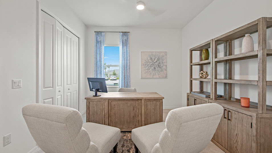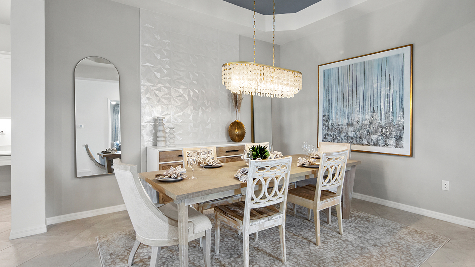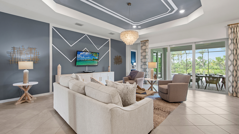 This new single-story home enjoys a cohesive modern design uniting the spacious kitchen, family and dining rooms that’s ideal for shared living. An expansive lanai is accessible from the family room and the owner’s suite, while a den and secondary bedroom in the front of the home add flexibility.