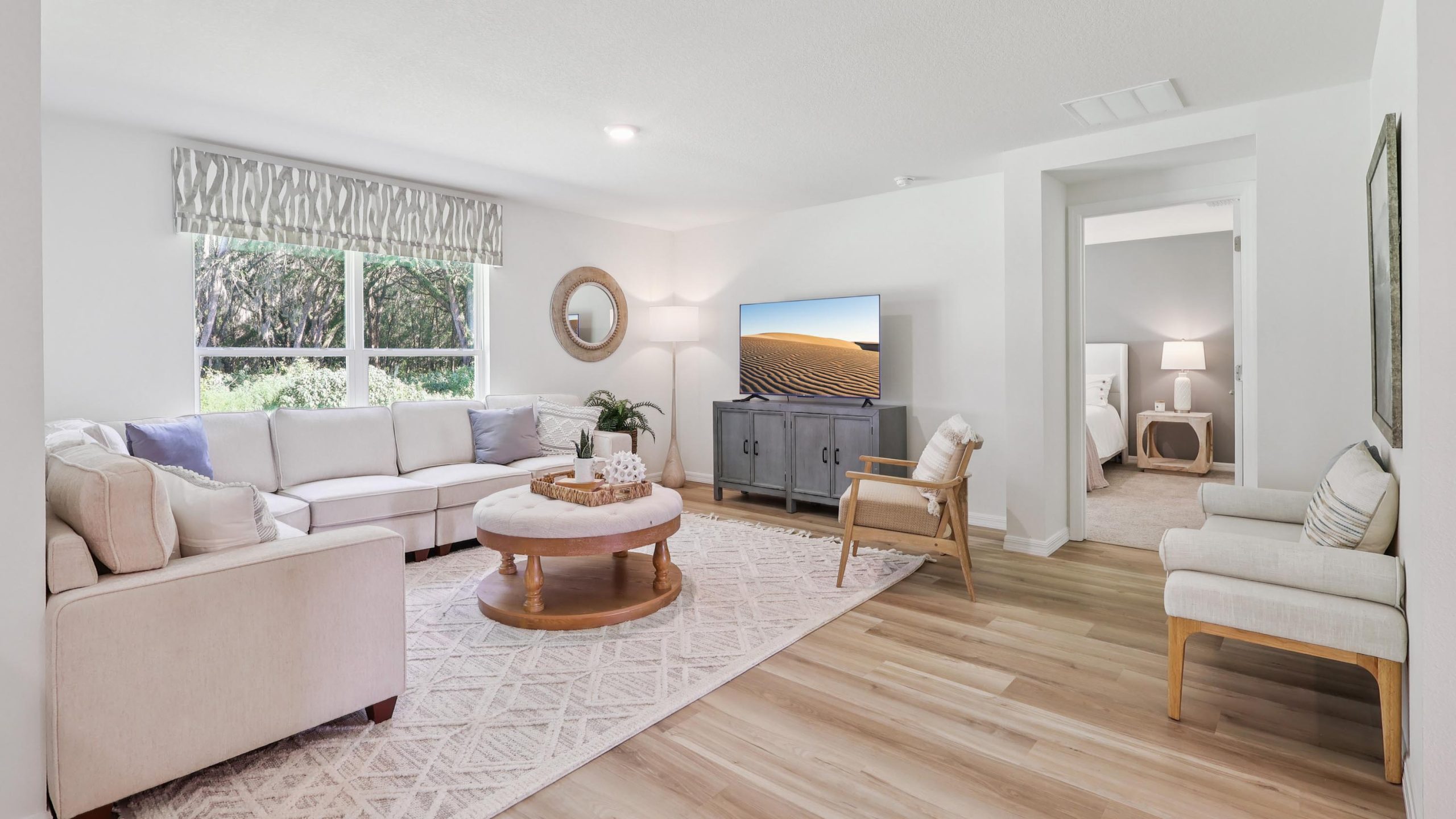The primary bedroom has an ensuite bathroom with a double vanity sink, quartz countertops, and two walk-in closets. The three remaining rooms share a well-appointed bathroom, carpeted floors, and a closet within each room. A dedicated laundry room is located just off from the kitchen and the 2-car garage.This residence embodies the perfect harmony of openness and privacy. Like all homes in Oaks Preserve, the Cali is complete with a state-of-the-art smart home system that keeps you connected to your home at all times, whether you’re 5-minutes or a plane ride away.