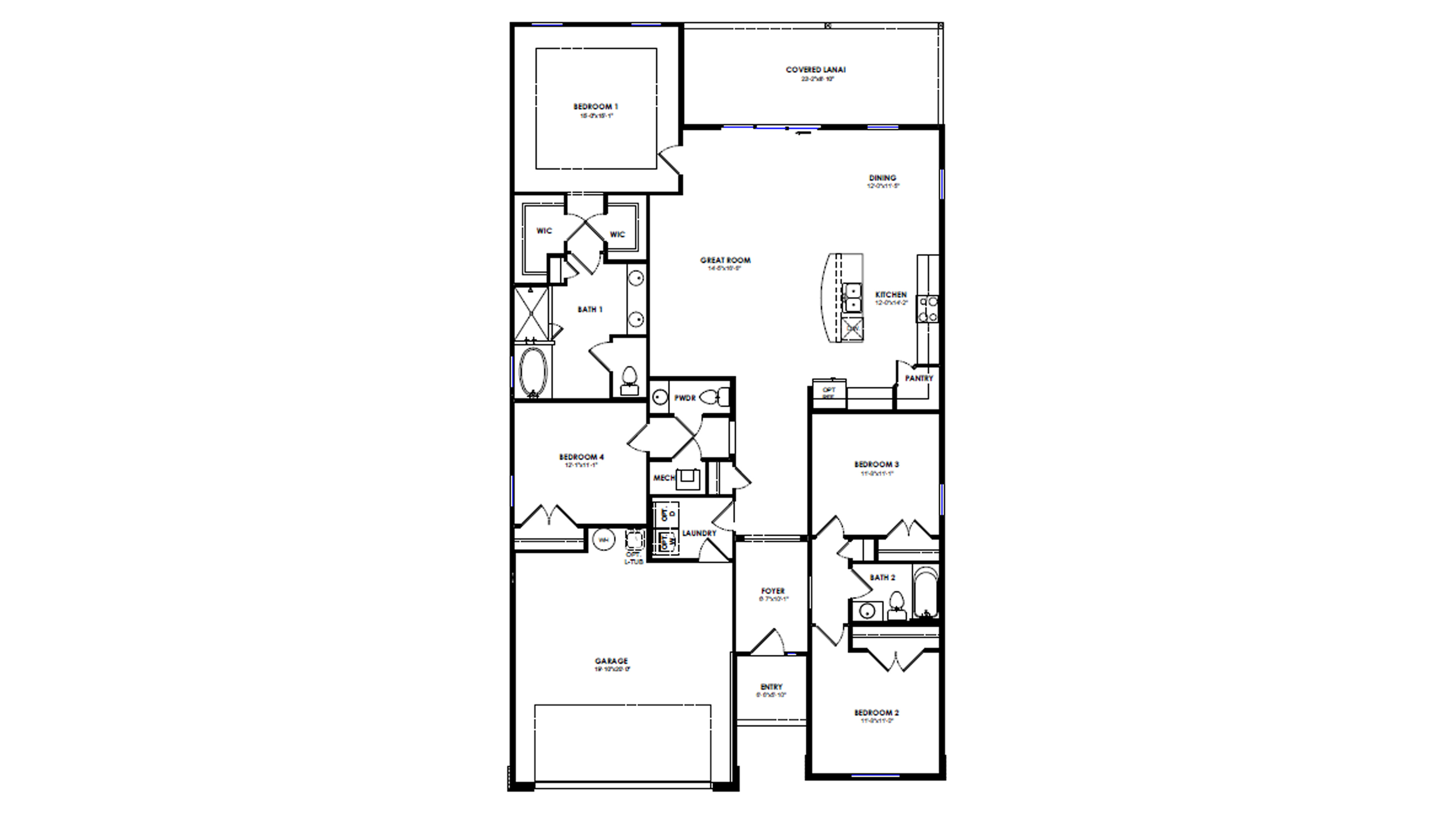 This one-story home has an open concept floor plan, featuring a spacious kitchen overlooking large living and dining areas that flow out to a covered lanai, a perfect place to relax or dine alfresco. At the front of the home, you will find two bedrooms that share a full bath, a laundry room off the garage, a fourth bedroom that is an optional den, and a powder bath. Bedroom 1 which includes Bathroom 1, is located at the back of the home for optimum privacy. This home comes with an installed stainless-steel dishwasher, range, and microwave.