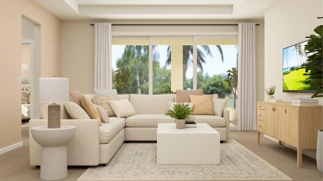 This new single-story home design combines modern comfort and style. An open-plan layout connects the kitchen, family room and the casual and formal dining spaces together to promote everyday living, while nearby are sliding glass doors to an intimate lanai. The lavish owner’s suite with a spa-style bathroom and the three secondary bedrooms are situated on opposite sides of the home for enhanced privacy.