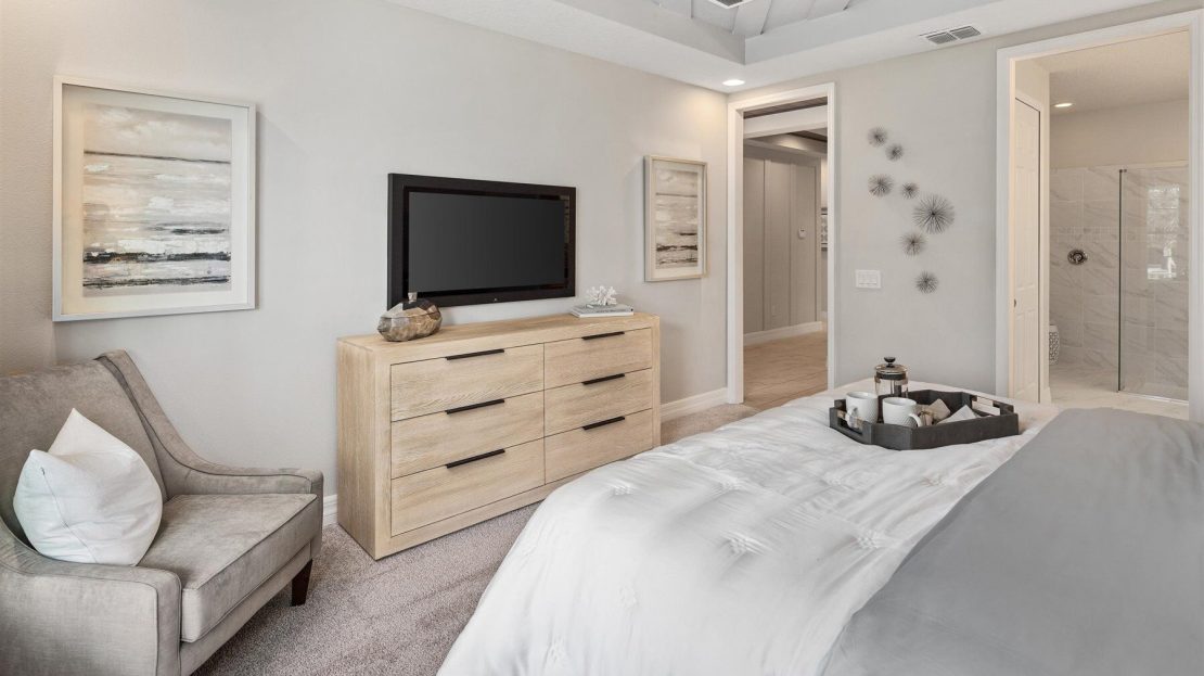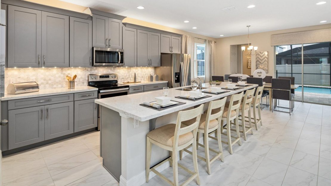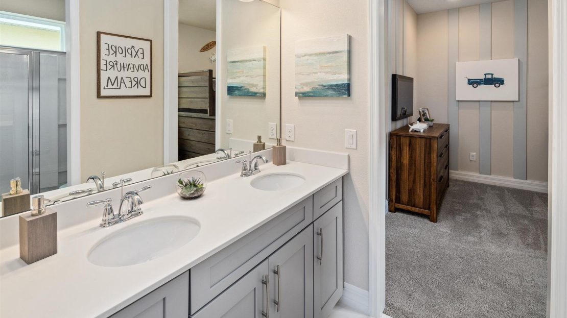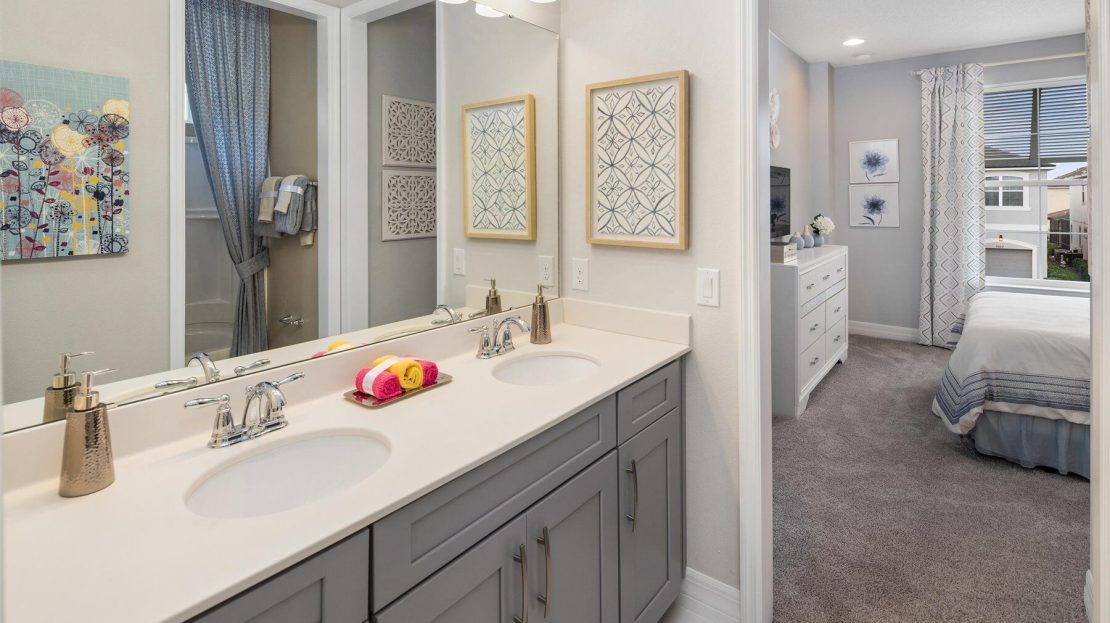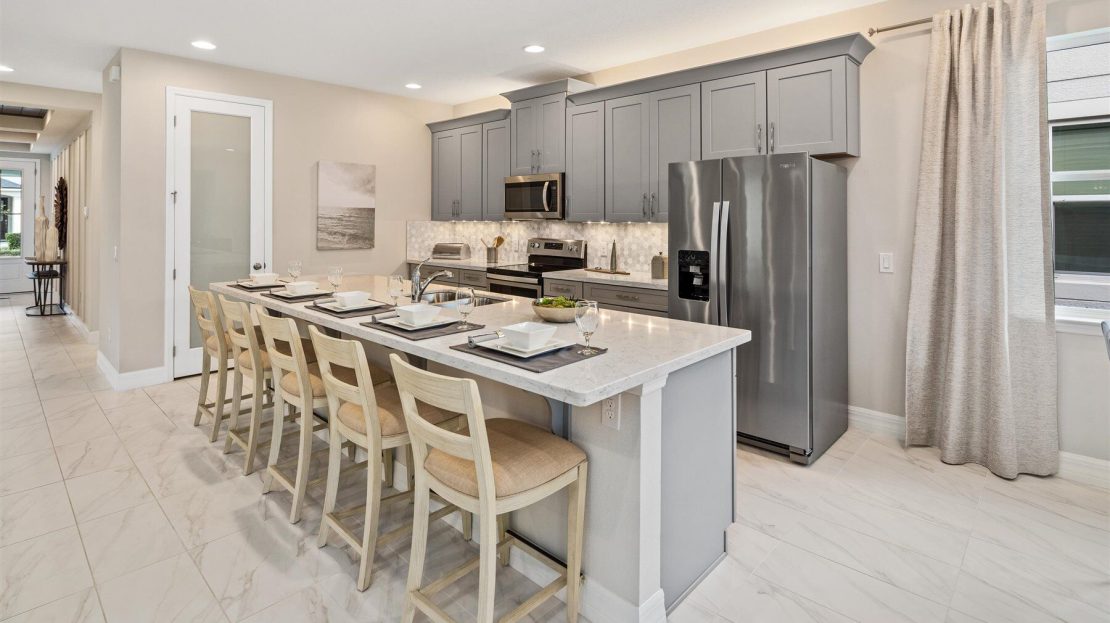Upon entering The Laguna III, guests are greeted by a grand foyer that leads to a home built with entertaining in mind. The kitchen features an expansive island complemented with granite counter tops, a breakfast bar, a chef-worthy pantry, a breakfast nook and stainless-steel appliances. At 2,700+ square feet, The Laguna III boasts 6 bedrooms, 4.5 bathrooms, a 2nd-story loft and a gathering room bathed in natural light from the adjacent covered lanai. Located on the 1st floor and featuring generous closet space and an owner’s bath with a double sink vanity, the owner’s suite is the perfect oasis for guests to relax and unwind after a long day. Melt away stress and take advantage of the Florida heat by taking a dip in the home’s adjoined private covered pool. The Laguna III is available in the Coastal and Modern exterior styles.
