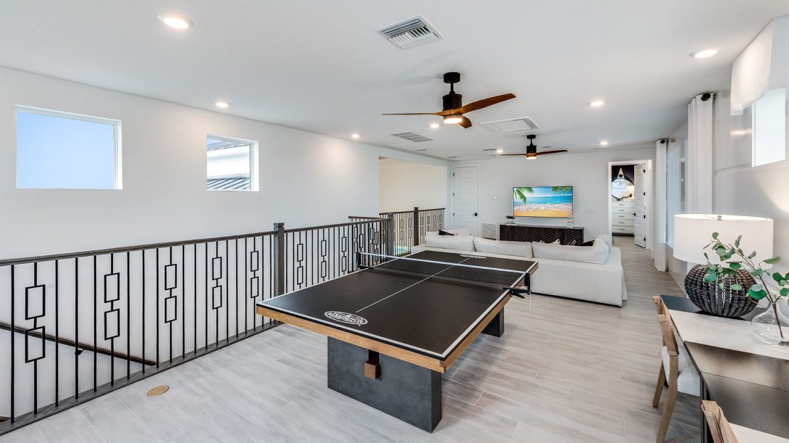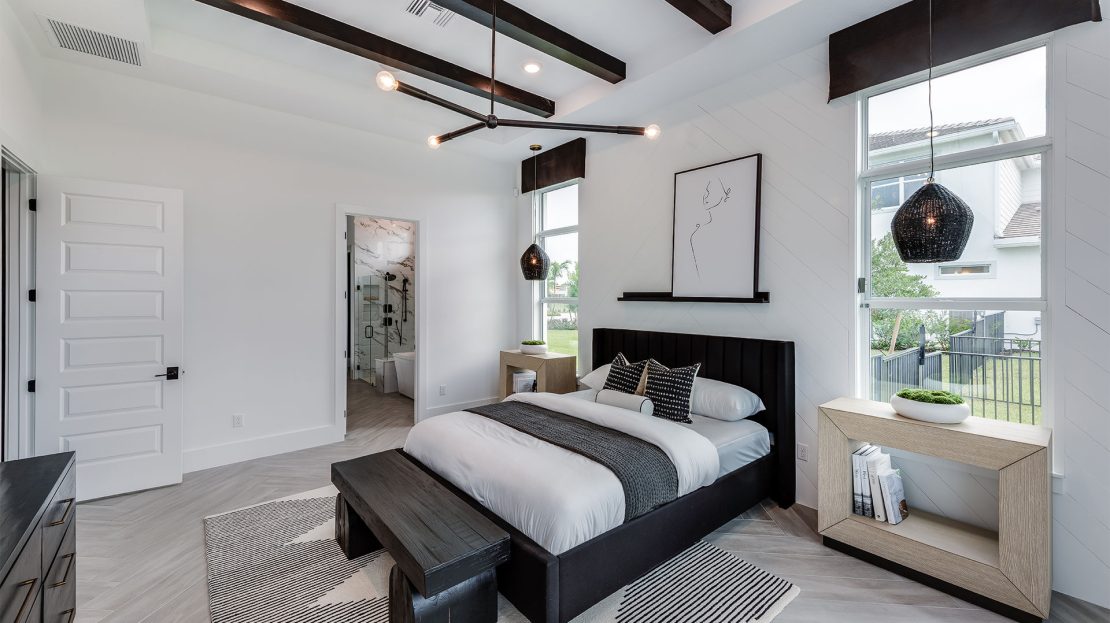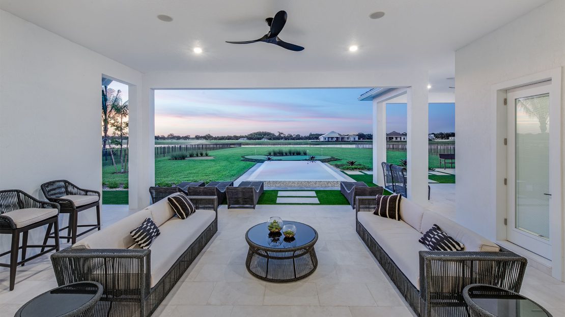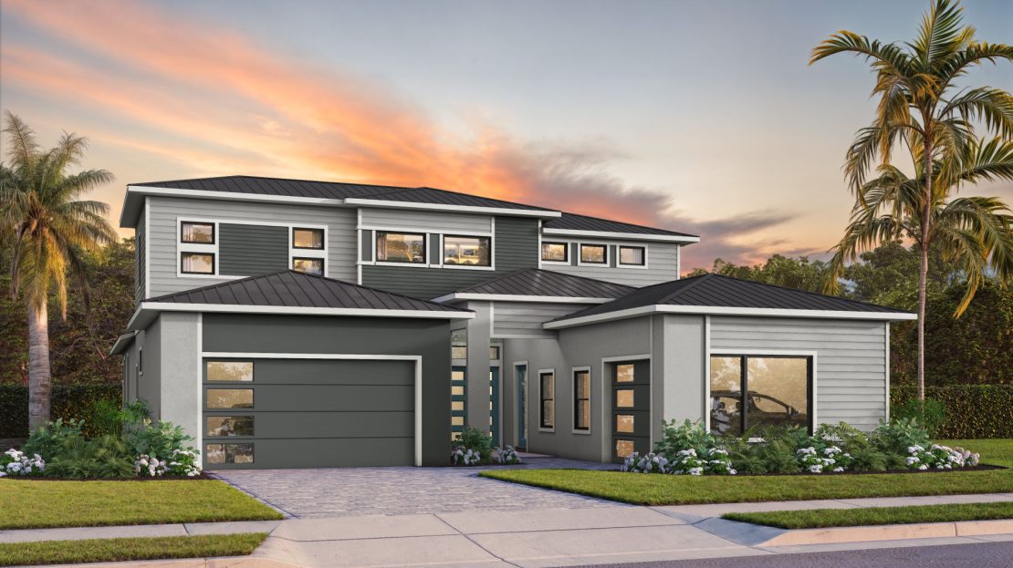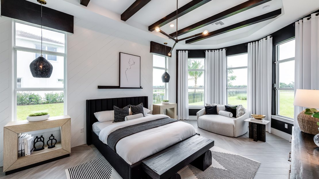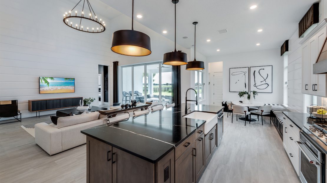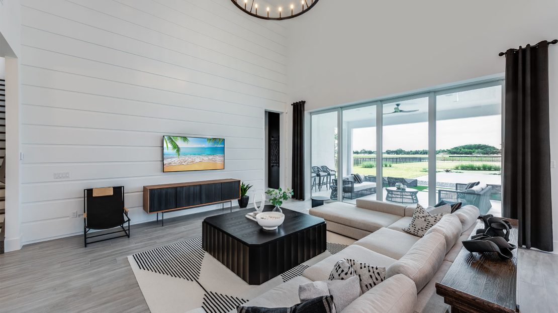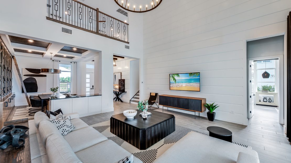 The Madeira at Amara is celebrated for its exceptional entertaining spaces. Relax on the covered lanai or take advantage of the inviting pool options. Inside, the home features clean lines and an open layout, enhanced by elegant, durable designer finishes and abundant natural light that together create a stylish and welcoming atmosphere.