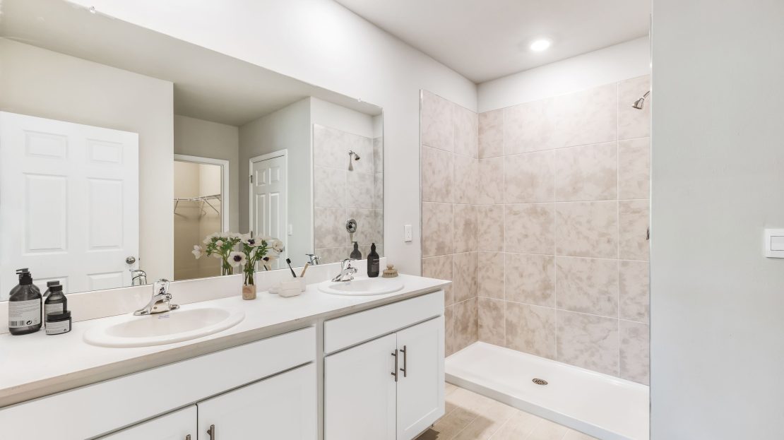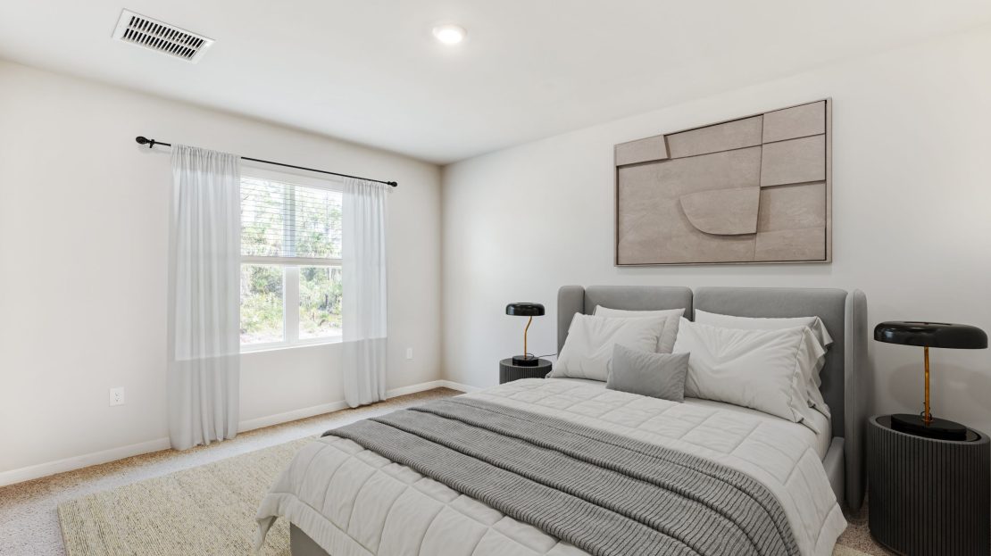 The large primary bedroom located at the back of the home for privacy, can comfortably fit a king-size bed, and includes an en suite bathroom with double vanity, spacious walk-in closet, and separate linen closet. Three other bedrooms share a second bathroom with the fourth bedroom located away so that it can be used as a den, flex space, or bedroom. The two-car garage connects to the front hallway where the laundry room and an extra storage closet are also located.