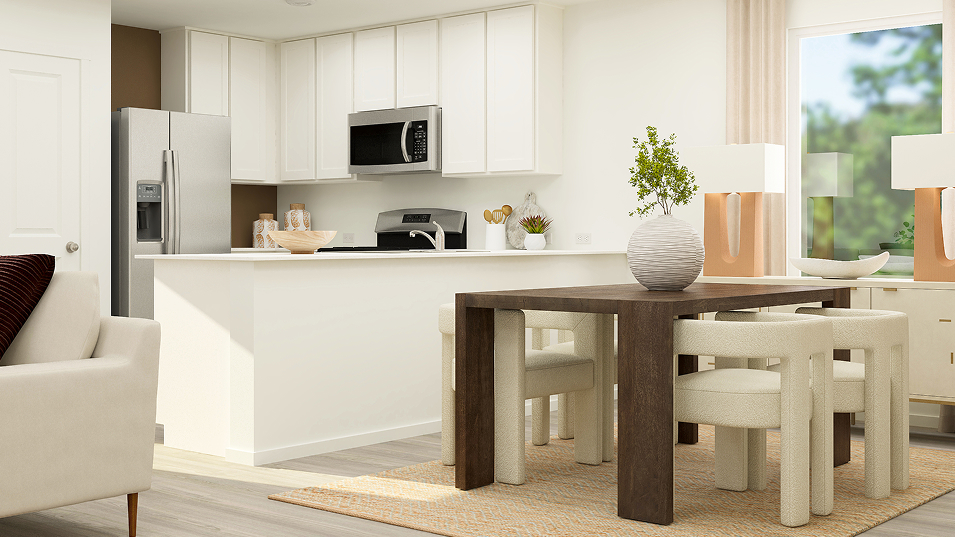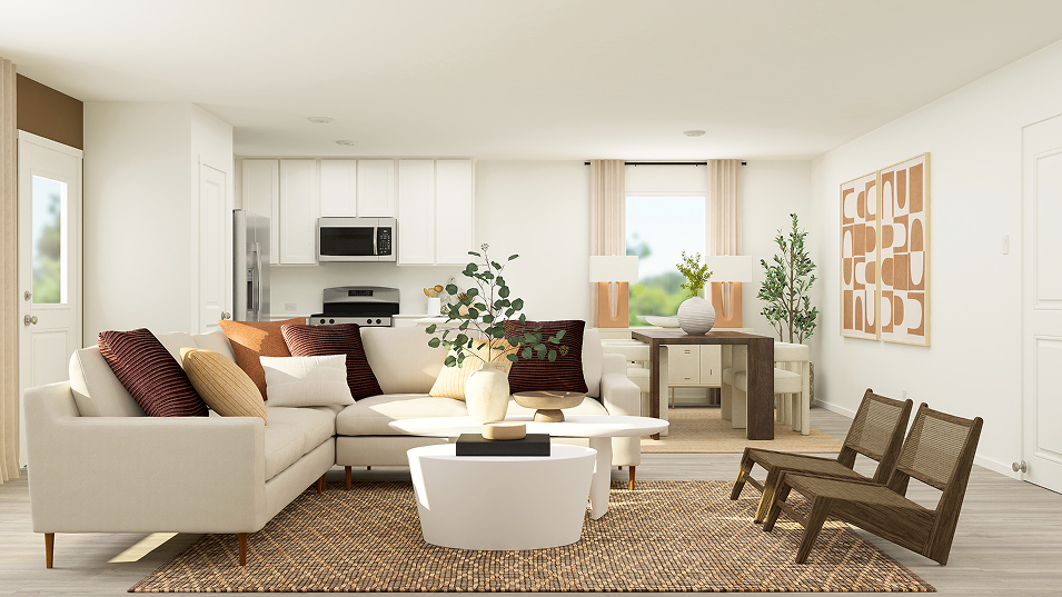 This new single-story home offers a modern and low-maintenance layout. Two secondary bedrooms surround a full bathroom at the front of the home, leading to an open-concept layout shared between the kitchen, living and dining areas. A lavish owner’s suite is nestled into a private rear corner and features an en-suite bathroom and walk-in closet.