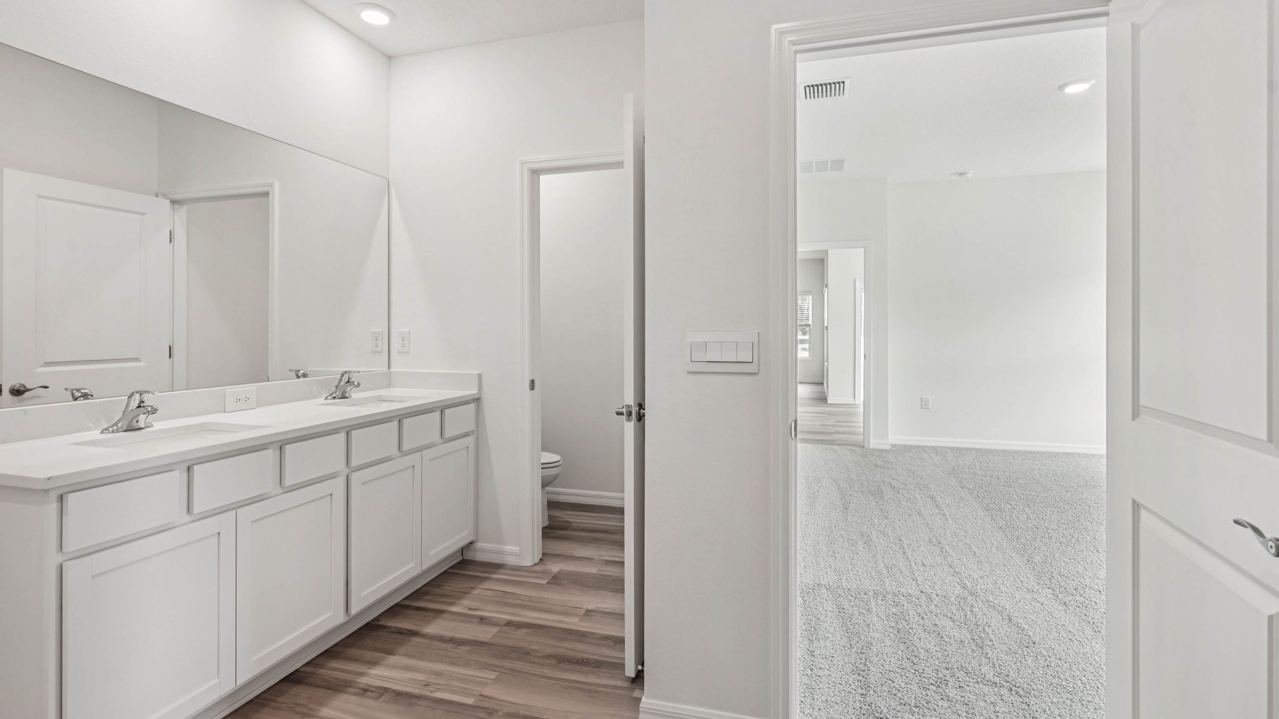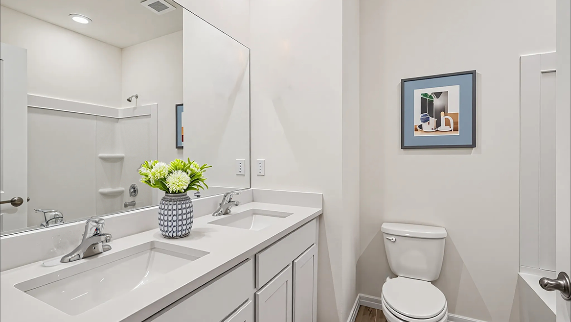 This home embodies the perfect harmony of openness and privacy. The primary bedroom is set in the rear of the home for added privacy and includes a large walk-in closet and a double vanity sink with quartz countertops. Two more bedrooms share an additional full bathroom. Like all homes in Avalon Woods, the Covington is complete with a state-of-the-art smart home system that keeps you connected to your home at all times, whether you’re 5-minutes or a plane ride away.