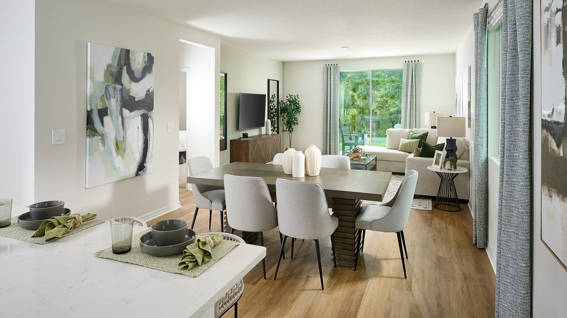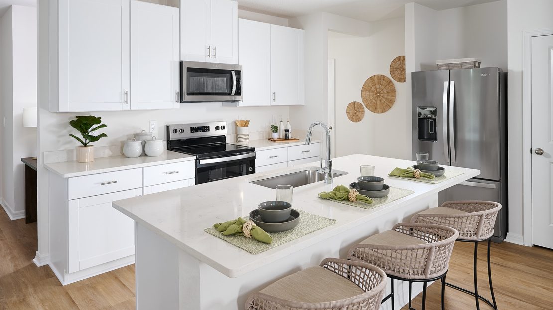 The Acadia home makes entertaining easy with an open kitchen, dining area, and great room. The primary suite is tucked in the rear of the home, offering plenty of privacy and features a spacious walk-in closet and shower.
