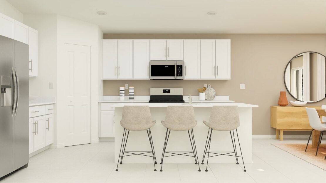 This new single-story home is designed for modern comfort and convenience. Two secondary bedrooms frame a bathroom in the hall at the front of the home, while a third is around the corner with a private bathroom. Flowing seamlessly from these spaces is the open living area, featuring a modern kitchen, a cozy dining area and a spacious family room that extends outside to the patio. The owner’s suite is tucked into the back corner with an attached bathroom. A three-car garage rounds out this gracious layout.