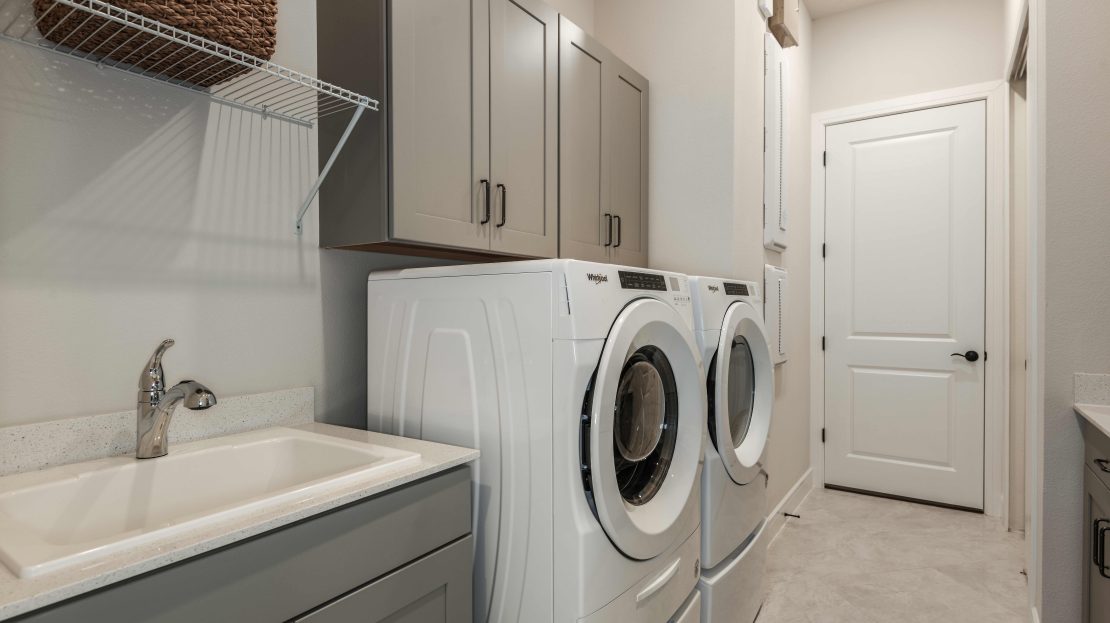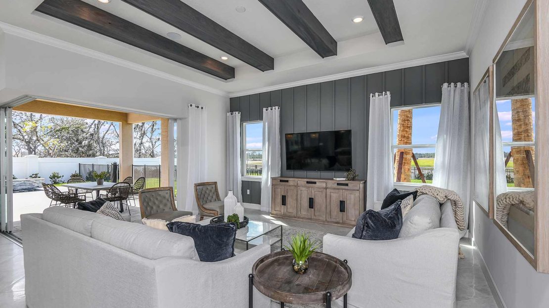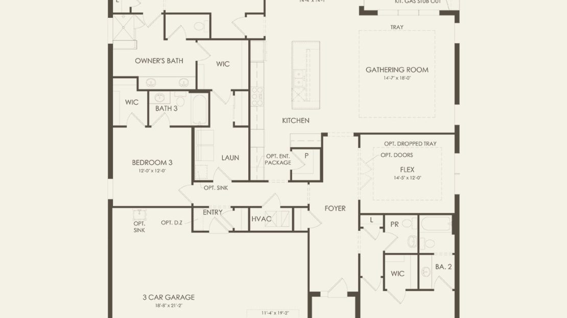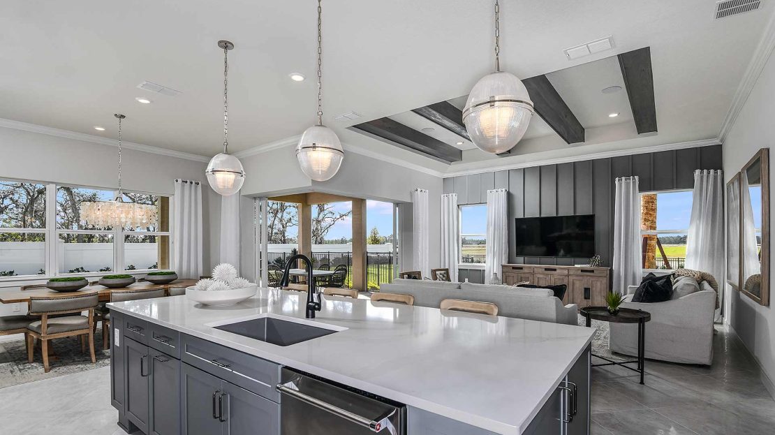 The Renown new home design features a spacious gathering room with an optional zero-corner sliding glass door that opens up to the large covered lanai. The private owner’s suite provides plenty of space with its dual walk-in closets and a laundry room pass-through. Enjoy two additional bedrooms and a flex room perfect for a home office or gym.