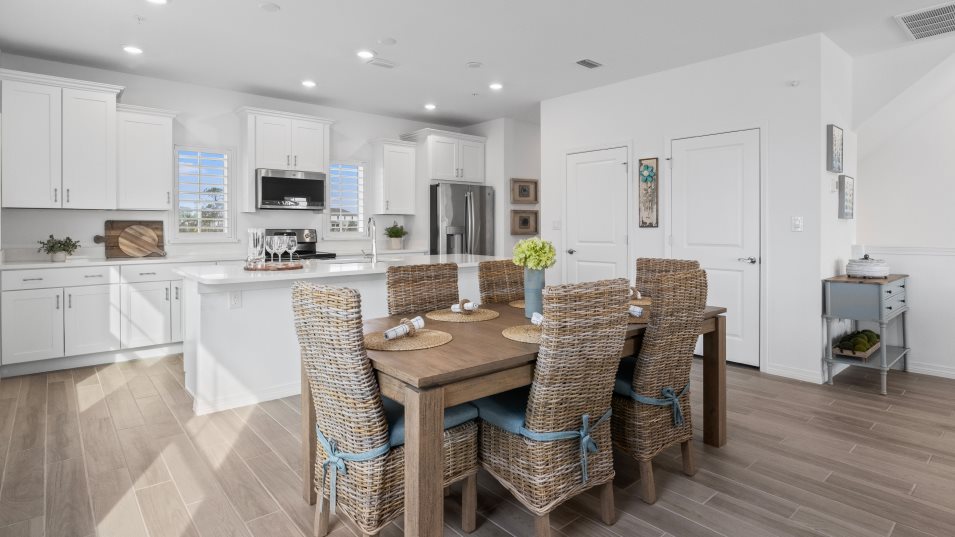 The interior of this three-story townhome starts on the second level, where the gathering room, dining room and kitchen conveniently share an open floorplan that allows for seamless transition between spaces. Indoor-outdoor living is made simple with a covered lanai. Three bedrooms occupy the top level of this home.