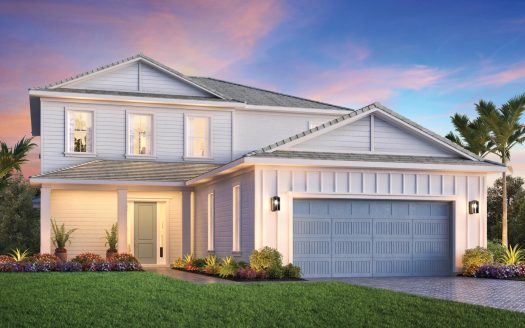 The Shearon Antilles home offers 3,636 sq ft. featuring four bedrooms, three full baths, and one half bath. The elegant foyer leads to an open-concept design with a spacious great room highlighted by a sophisticated tray ceiling and views to the expansive covered lanai with tranquil preserve views. Luxury vinyl plank flooring runs throughout the main living areas, primary suite, and upstairs loft. The gourmet kitchen includes a large center island with breakfast bar, wraparound countertops, and a spacious casual dining area. The first-floor primary suite offers a tray ceiling, dual walk-in closets, and a spa-like bath with soaking tub, oversized shower, dual vanities, and private water closet. An oversized secondary en-suite bedroom is ideal for guests. On the second floor, two additional bedrooms share a dual-sink bath. A custom pool completes this elegant retreat, for you to enjoy the Florida lifestyle right in your backyard.