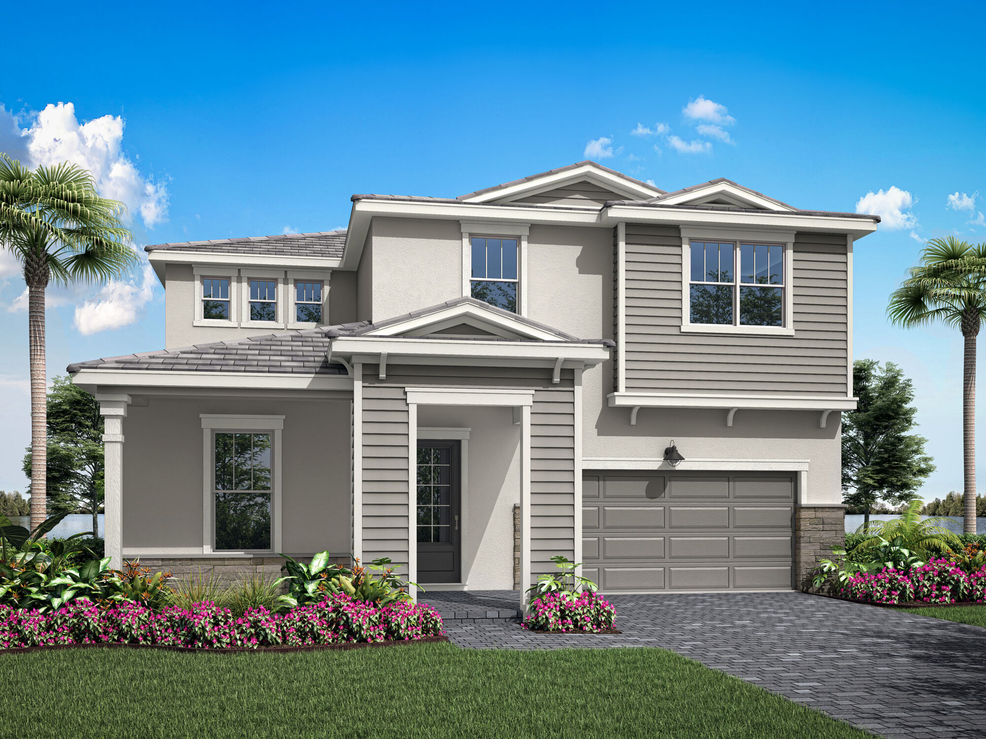 The Eau is a 2,585 sq. ft. 2-story home that offers 3 bedrooms, 2.5 baths and 2-car garage. Upon entering the foyer, you are welcomed to an open floorplan. The spacious kitchen offers an extensive walk-in pantry and an island breakfast bar. The kitchen overlooks the dining area and Great Room. A sliding glass door in the Dining Room leads to the covered lanai. The second floor is complete with a loft, owner’s suite and bath, two additional bedrooms and a full bath. The roomy loft offers a flexible living space. The owner’s suite boasts a large walk-in closet and is connected to the owner’s bath with a spacious shower and dual sink raised vanity. All of the secondary bedrooms have walk-in closets and share a full bath with double sinks. The laundry room is located upstairs for added convenience.