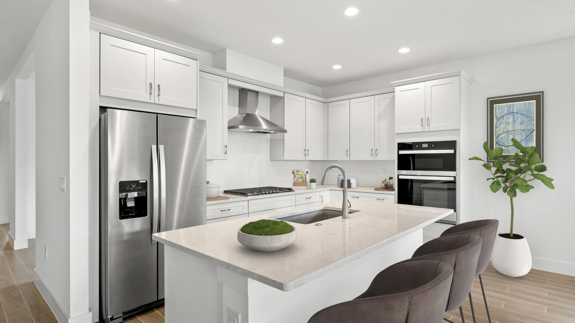 Gourmet kitchen with dual-tone wood cabinetry, stunning white quartz countertops, a 5-burner gas cook range, and a large wall oven—perfect for entertaining and culinary creations
