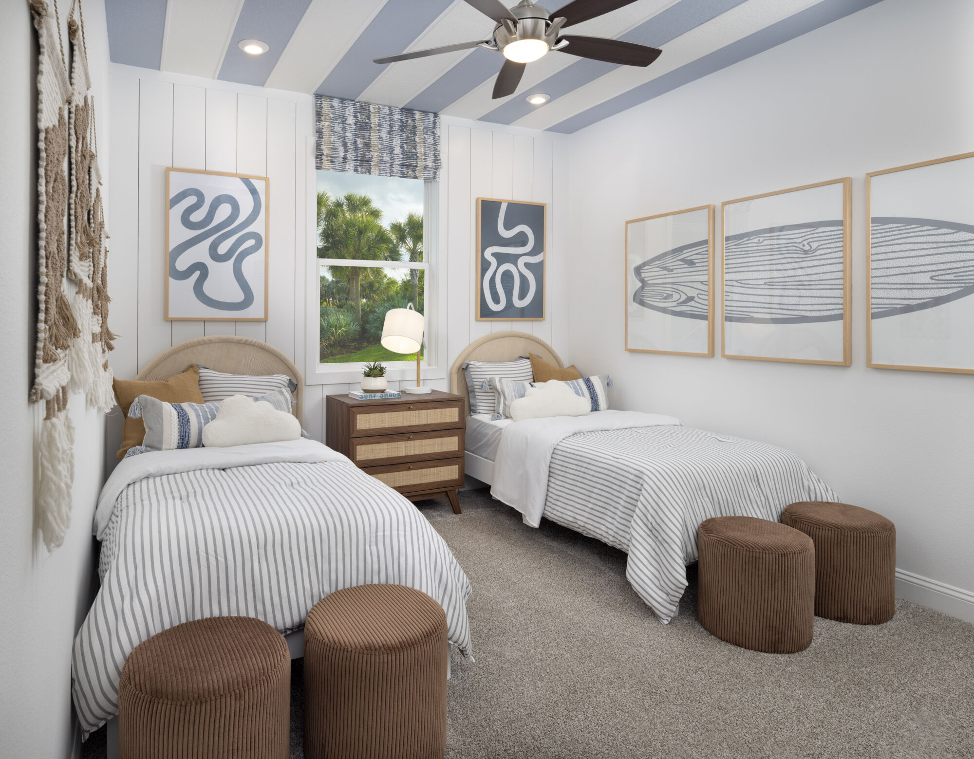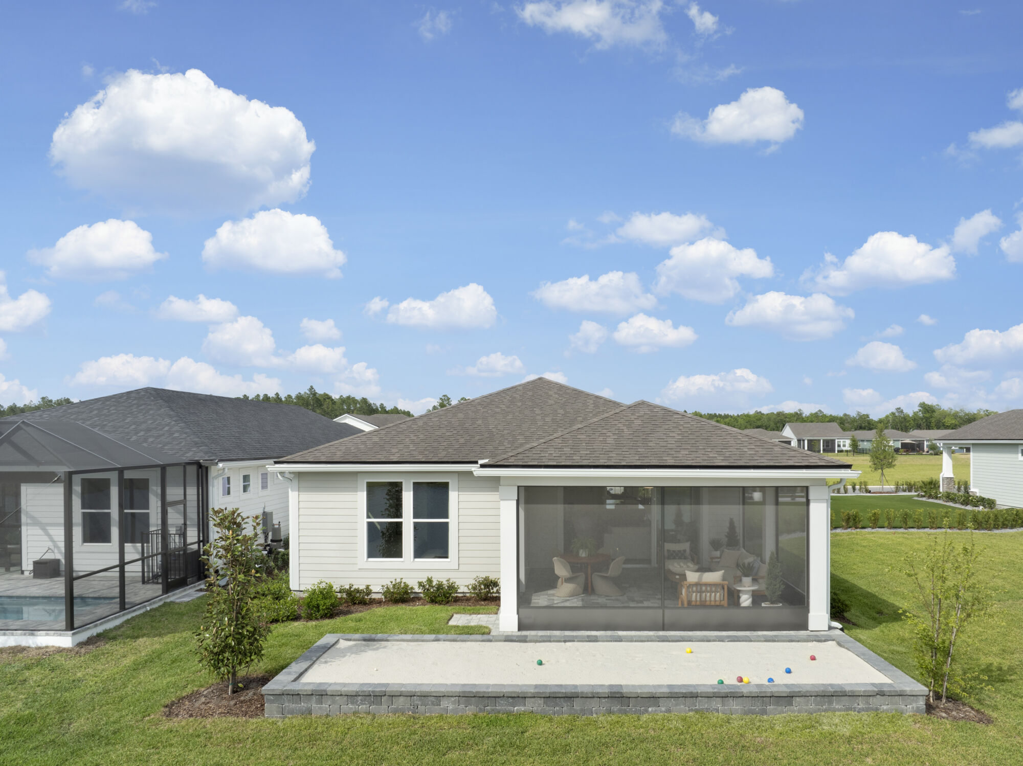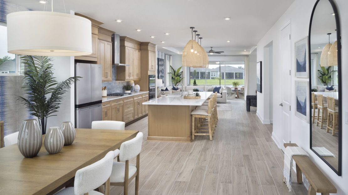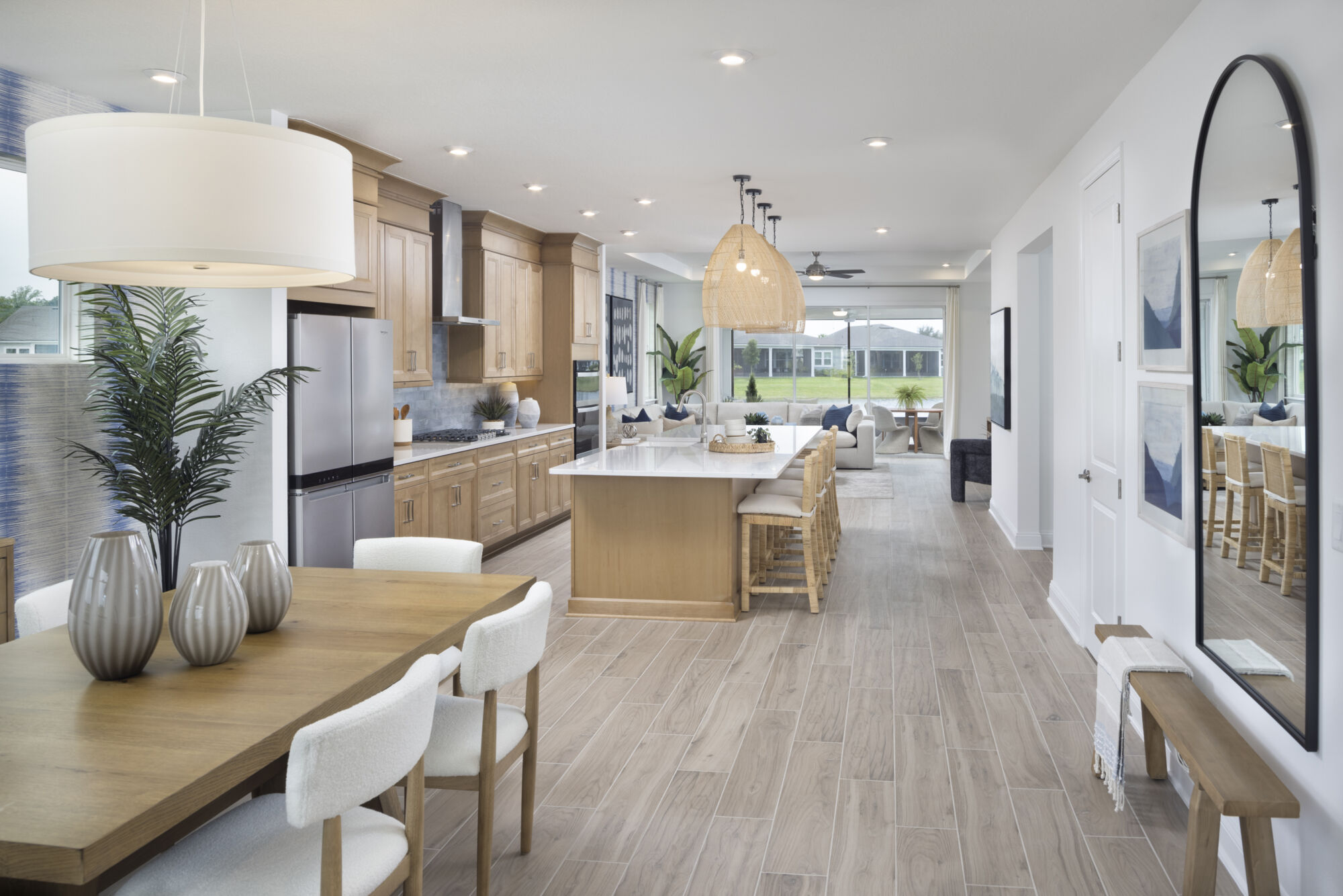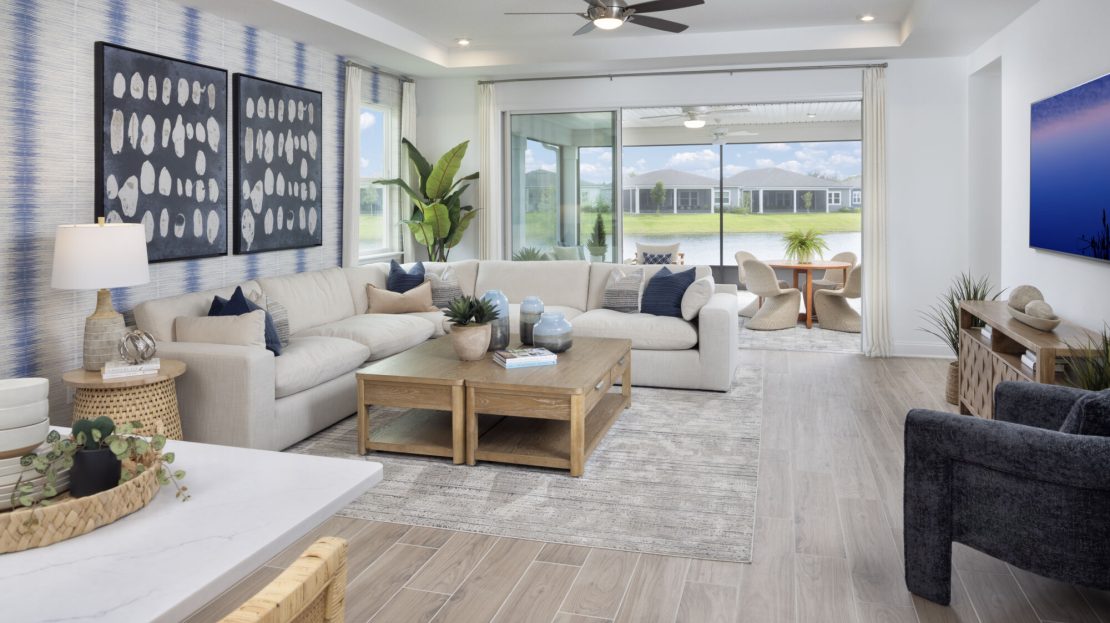 Step into the Cayman and immediately feel the open, airy charm that defines this home. The foyer gracefully leads into the dining room, while the kitchen island connects seamlessly with both the dining area and Great Room, offering an unobstructed view of the bright, open-concept space. The expansive living area flows out onto the lanai, extending your living space outdoors. The kitchen also overlooks the flex room, which offers multiple possibilities—use it as a private study, a wellness studio, or even convert it into a third bedroom to suit your needs. A hallway connects the flex room to a bedroom located near the front door. The owner’s suite, located in the rear corner of the home, offers exceptional privacy, comfort, and convenience—qualities highly sought after by today’s homeowners. Just steps from the Great Room and lanai, the suite provides easy access to both the peaceful outdoors and the heart of the home, making it the perfect place to relax or entertain family and friends.