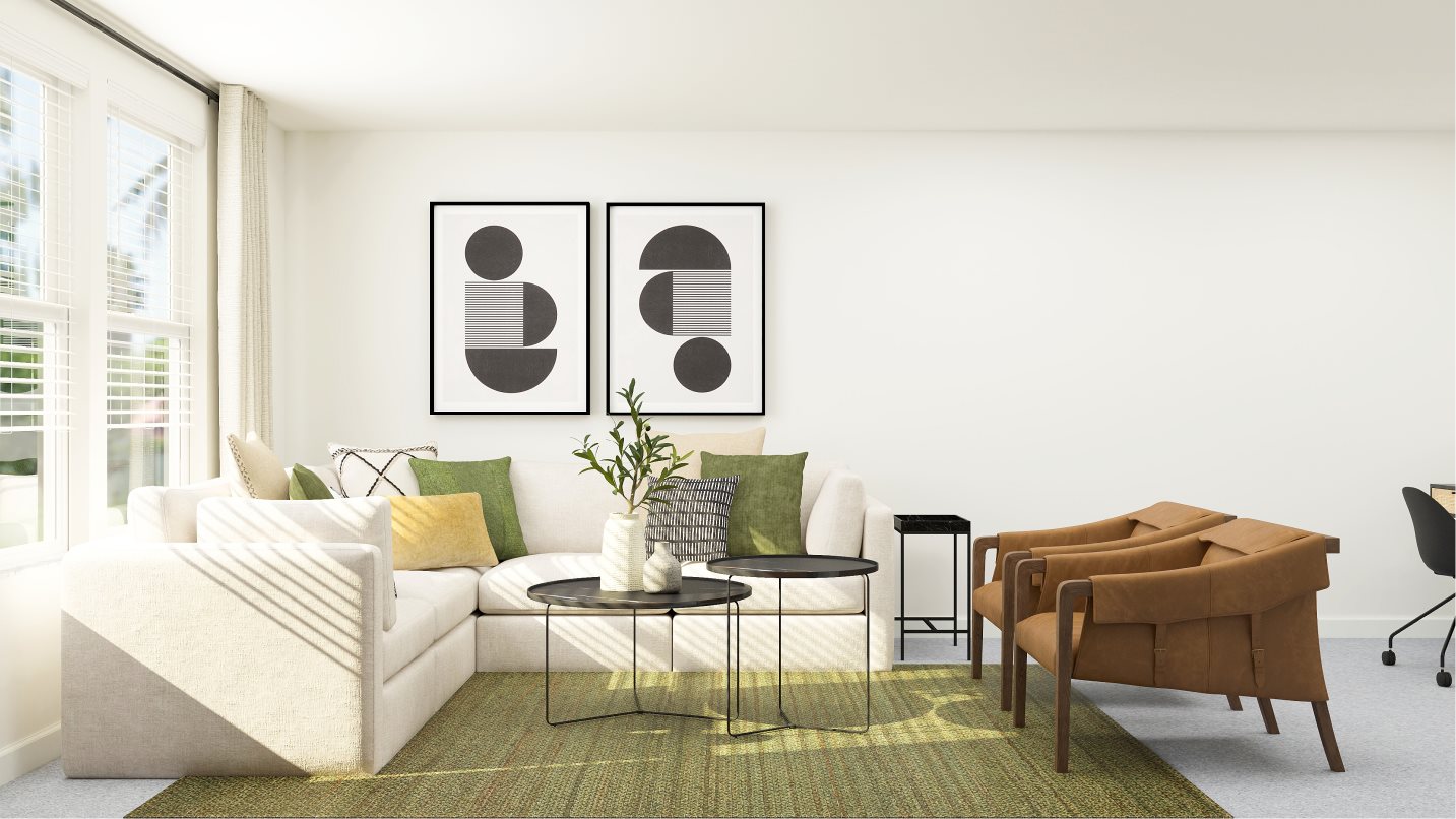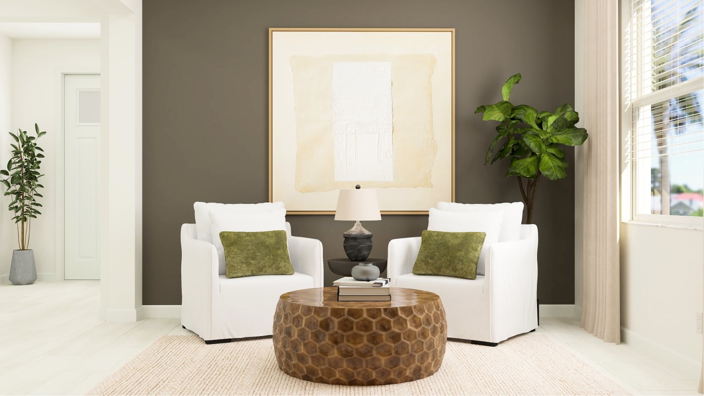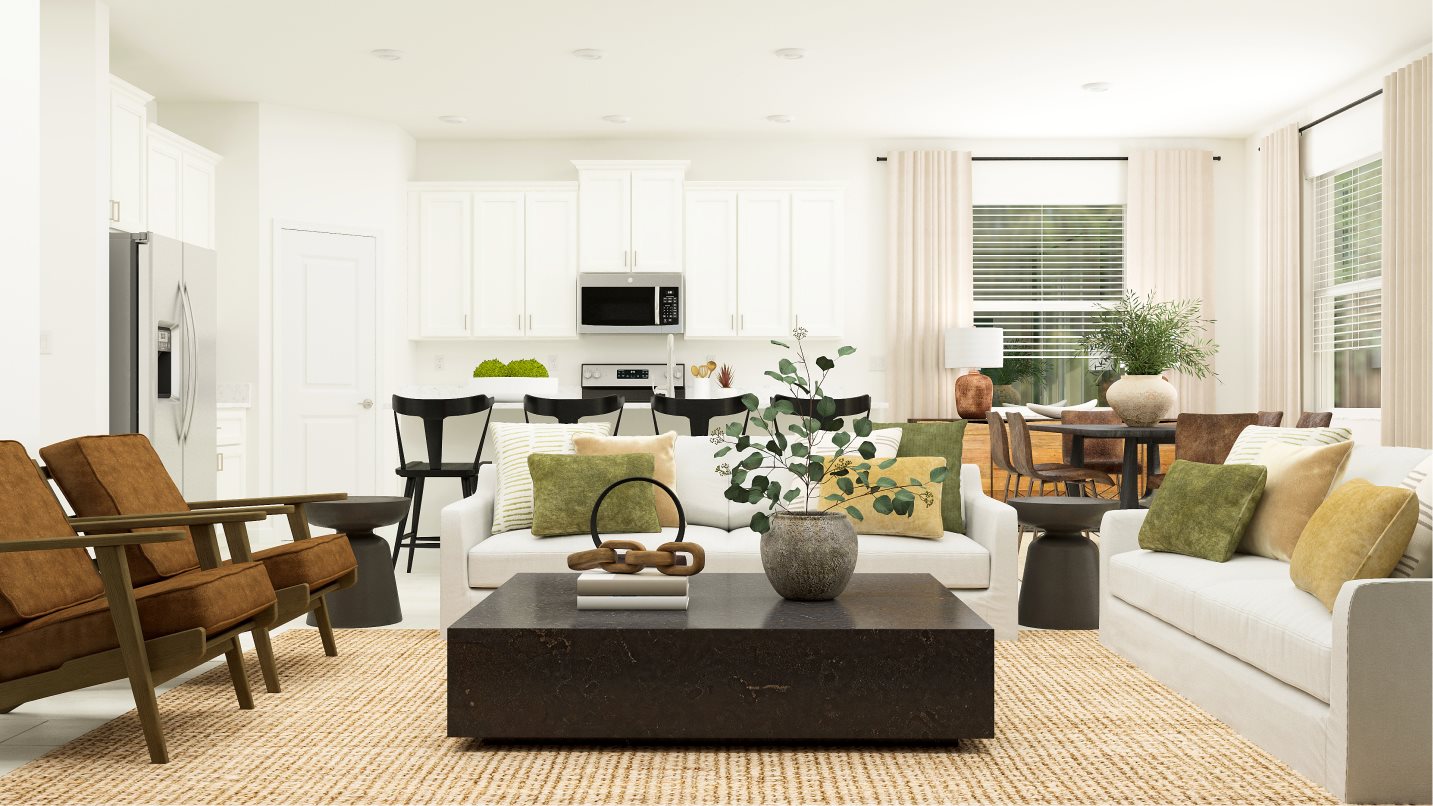 The collection’s only two-story plan centers on convenience. On the first floor, a flex space offers a place to explore hobbies, while the open design of the family room and dining room provide a contemporary style that leads to an expansive patio. The nearby owner’s suite is a tranquil escape, and throughout the home are two secondary bedrooms and an upstairs loft.