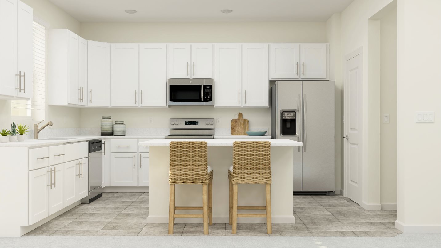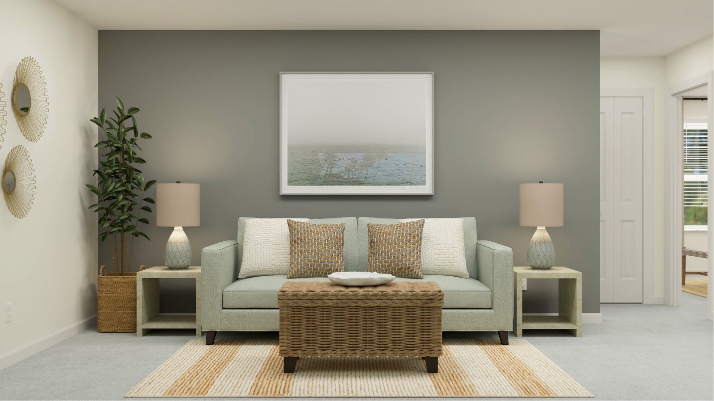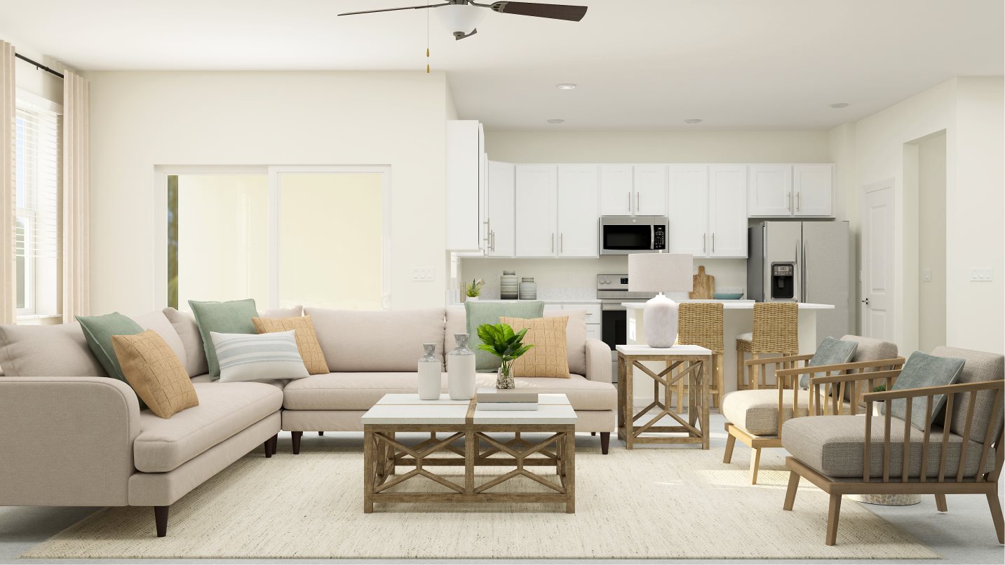 The largest plan in this collection showcases a modern open-concept floorplan on the first floor among the kitchen, family room, dining room and patio. Upstairs, a loft leads to two bedrooms and the comfortable owner’s suite, while a bonus room can become an extra bedroom, study or office space.