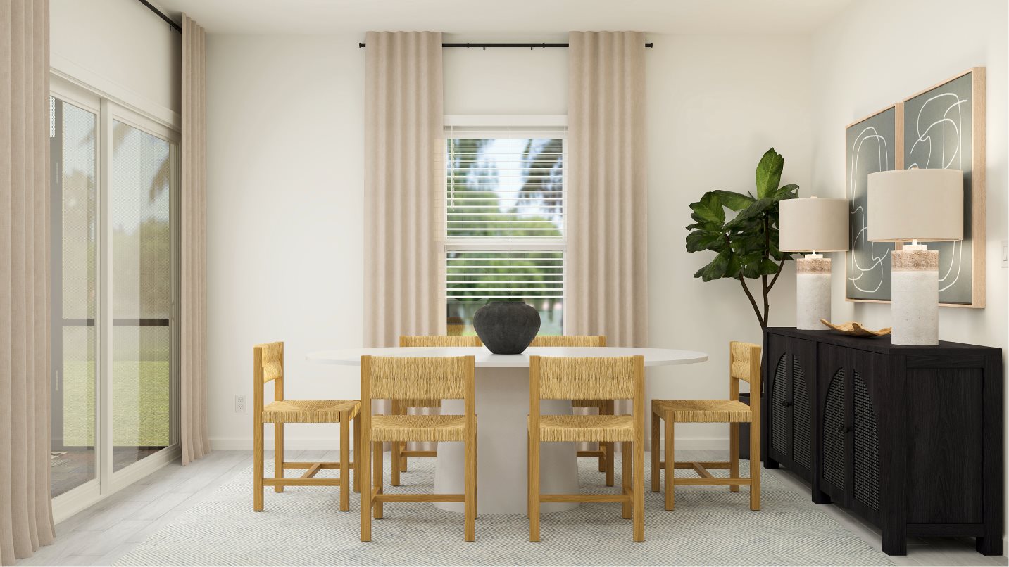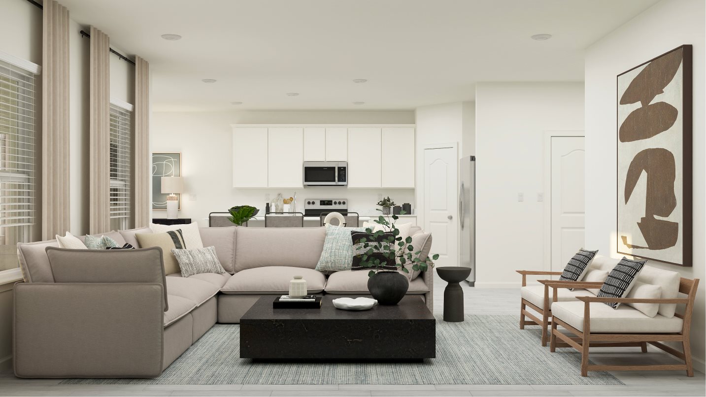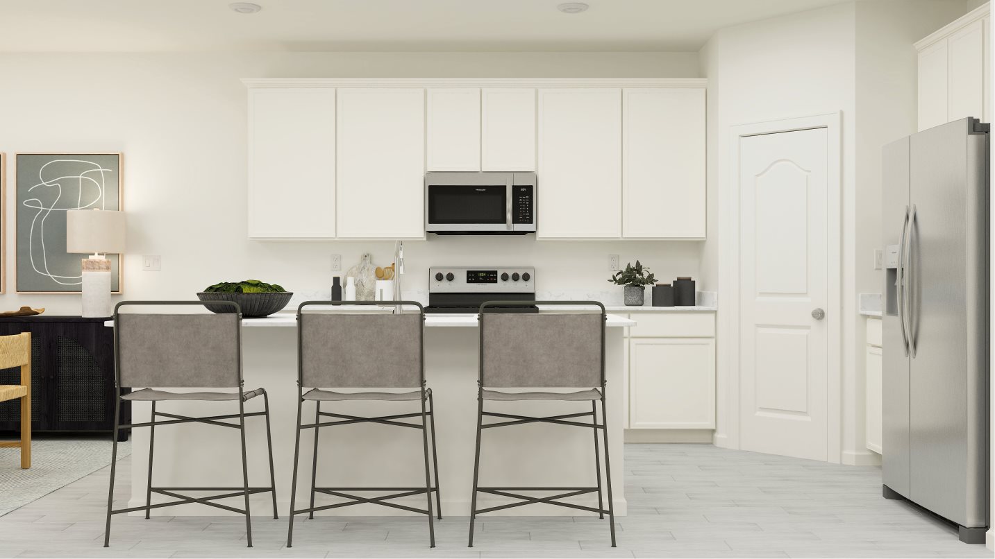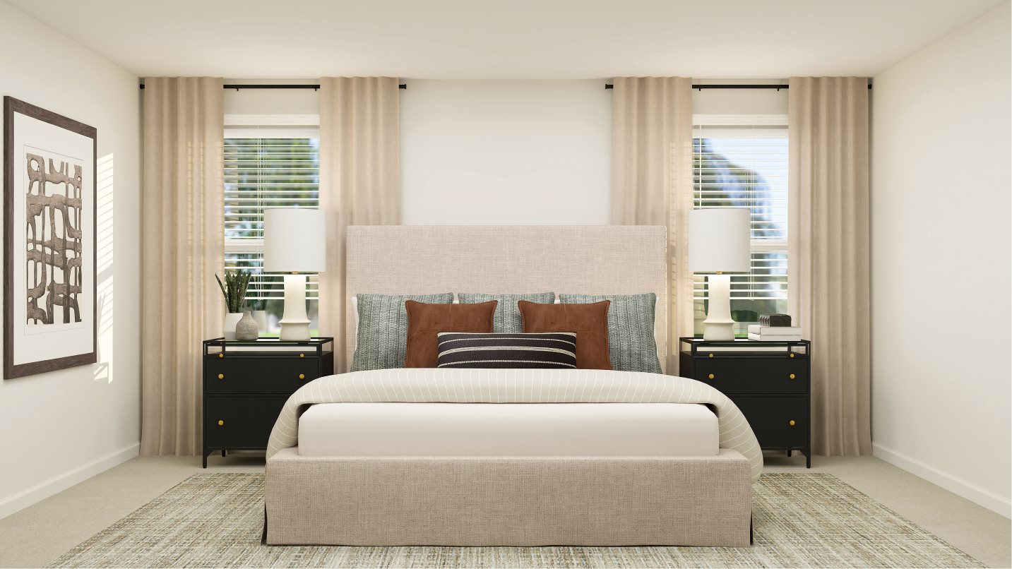 This two-story home is the largest plan in the collection. On the first floor is an open kitchen, dining room and living room with access to the outdoor entertainment area, along with a comfortable bedroom ideal for overnight guests. Upstairs is the luxe owner’s suite and two more bedrooms. Completing the home is a versatile two-bay garage for storage space.