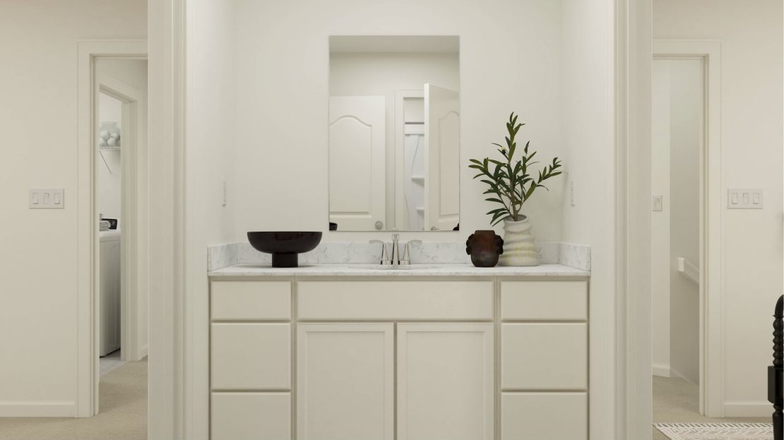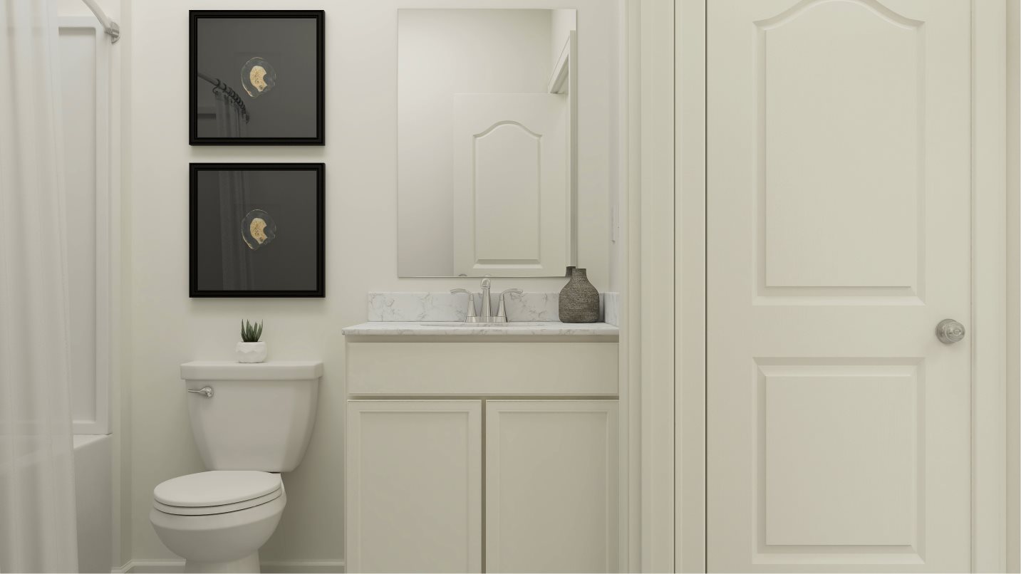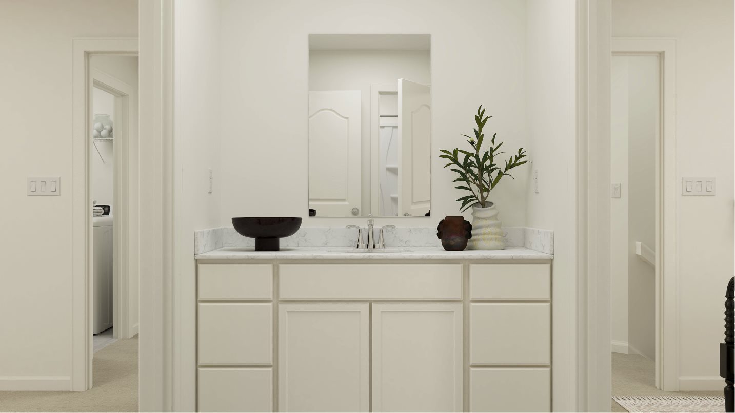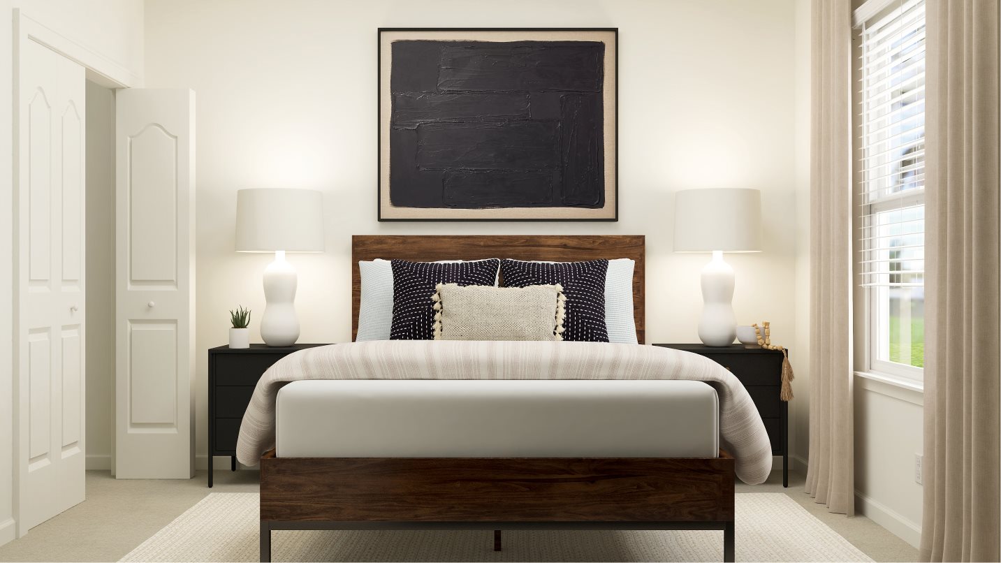 This two-story home is the largest plan in the collection. On the first floor is an open kitchen, dining room and living room with access to the outdoor entertainment area, along with a comfortable bedroom ideal for overnight guests. Upstairs is the luxe owner’s suite and two more bedrooms. Completing the home is a versatile two-bay garage for storage space.