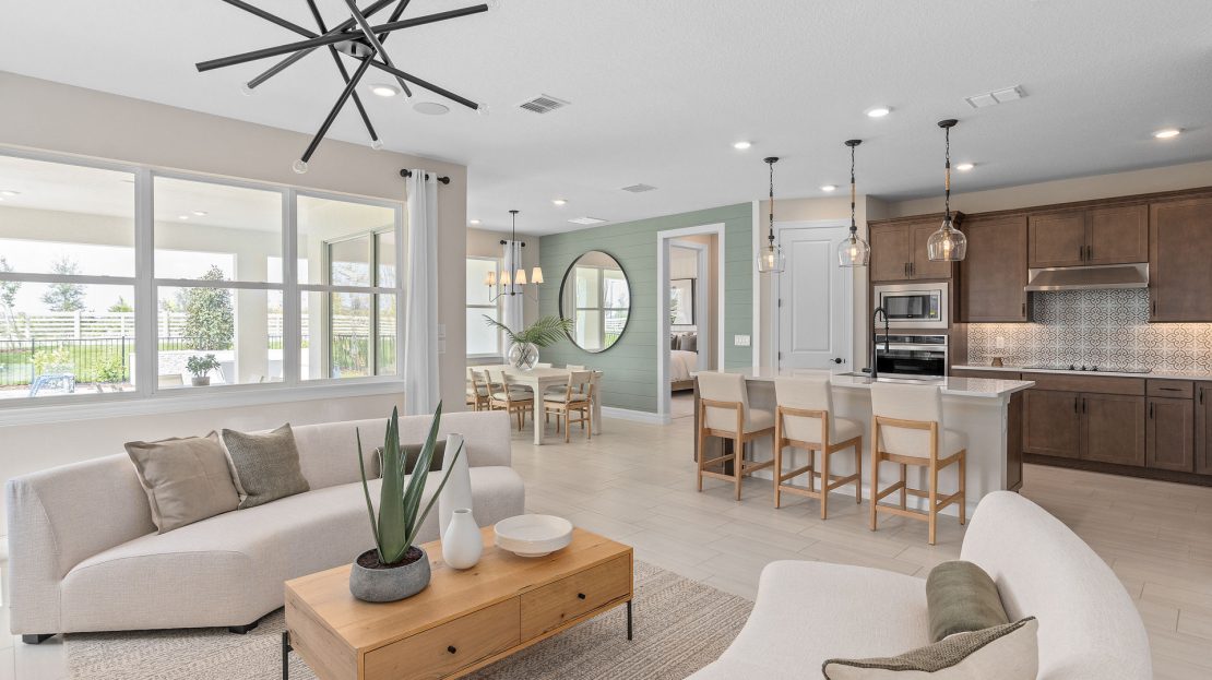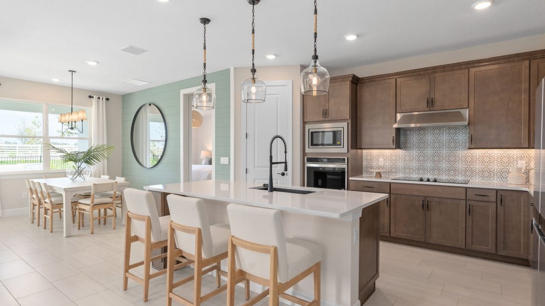 The versatile single-story Coral home design at Bridgewalk features a kitchen with a large island that overlooks a bright gathering room – perfect for entertaining and everyday living.
