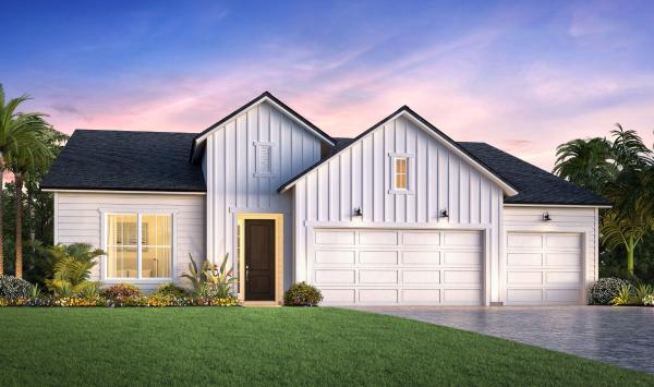 The all new pre-construction floorplan called the Robin Farmhouse, located at Mill Creek Forest in St. Johns, FL built by Toll Brothers. This Robin Farmhouse model has 4 beds, 3 baths, 0 half baths, 2670 sqft, 3 car garage, 1 story and priced from $644000. This Single Family style home features 1st-Floor Primary Bedroom.