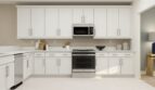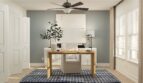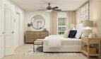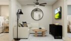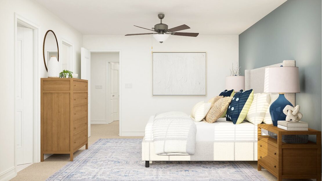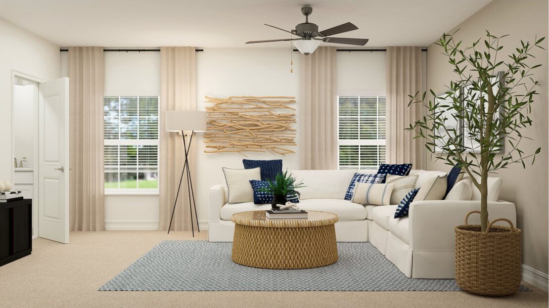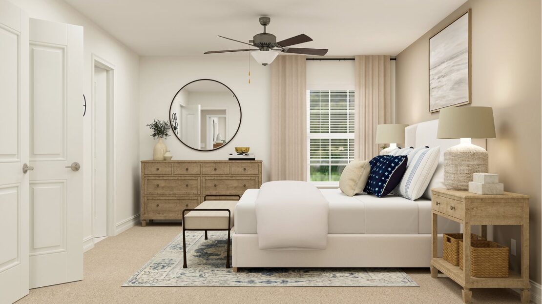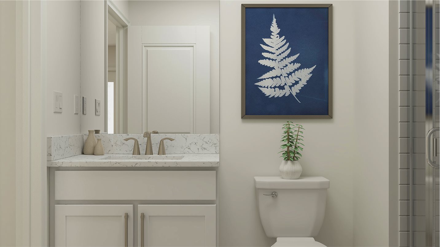 This three-story townhome thoughtfully optimizes space with a first-level guest bedroom that can double as an office. The second level offers an open design among the dining room and living room, with a well-equipped kitchen in between. The third floor includes two spacious owner’s suites and a versatile loft that can serve as a home gym or media room.