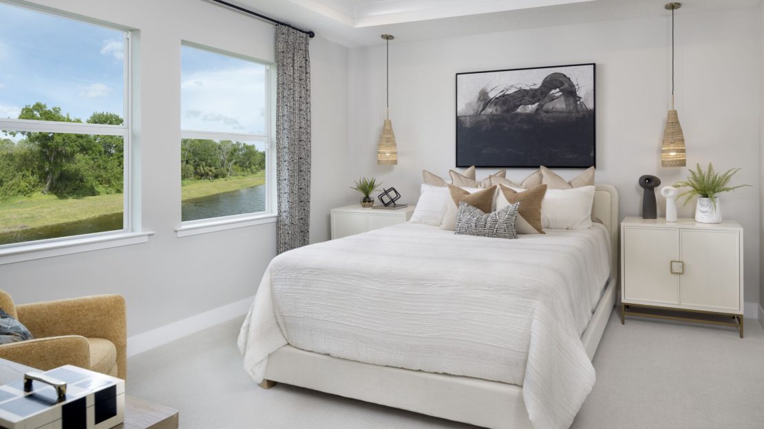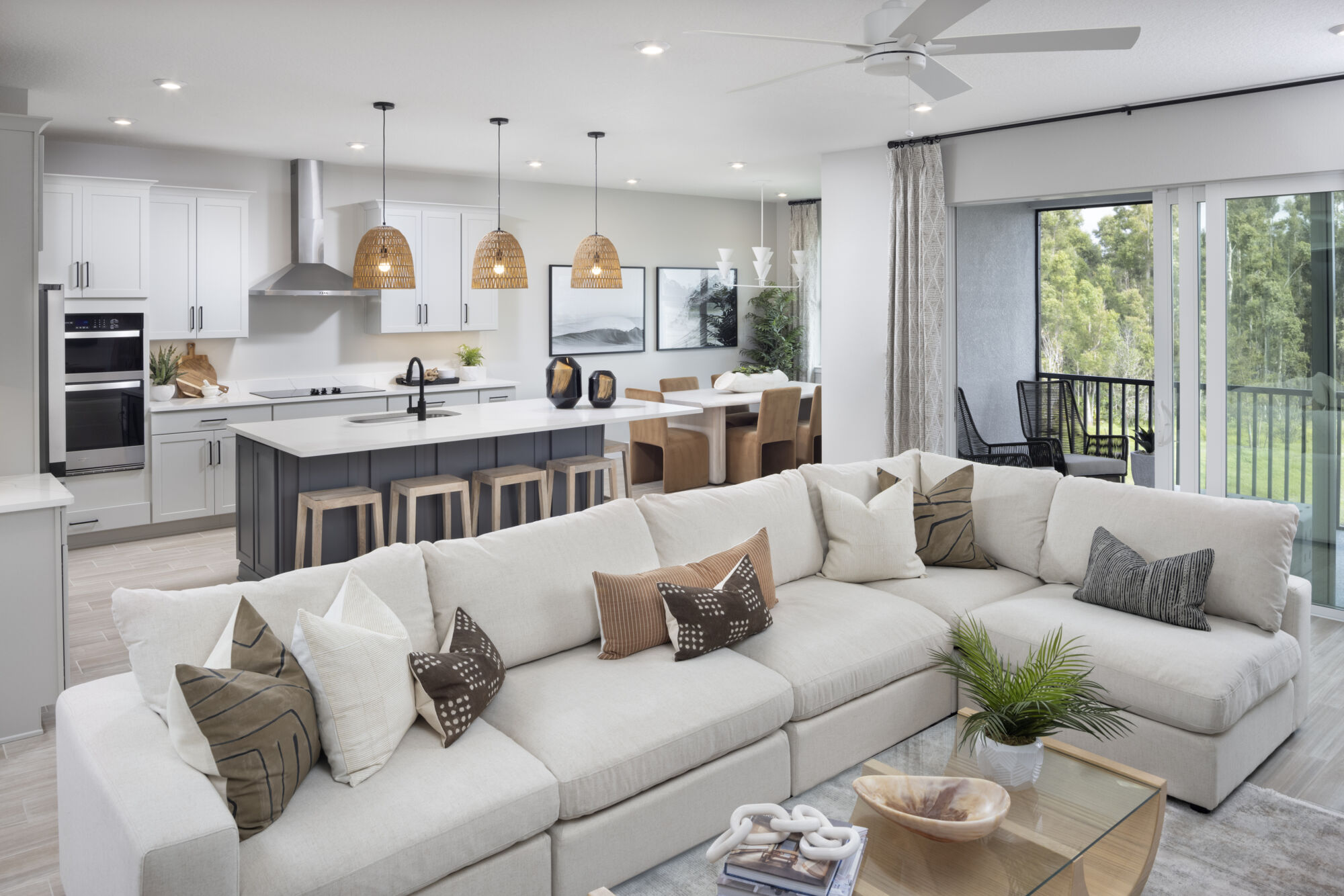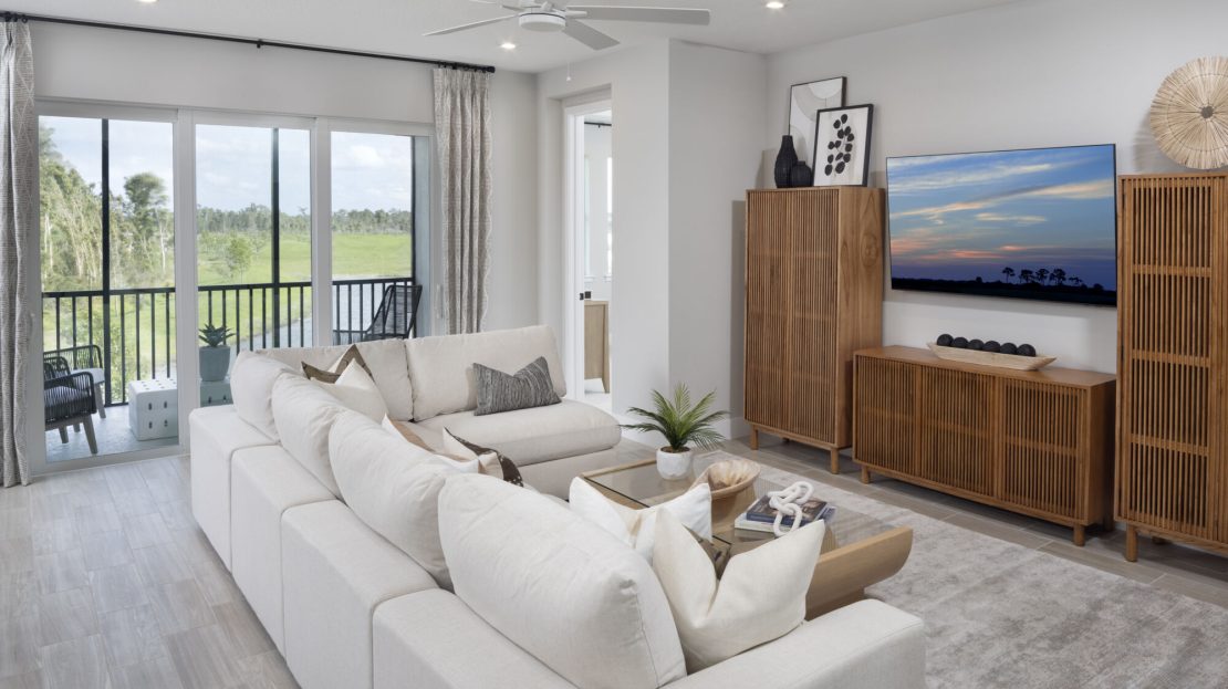 The award-winning Oceangrove II plan is the largest condo available in the community with 2 bedrooms, 2 baths, a flex room, a 2-car garage, and condominium ownership. This open floorplan offers optimized living spaces and is perfect for entertaining guests for a few hours or days. The entrance of this home features a welcoming covered entry or convenient owner’s garage access. The main living area is just up the stairs. The designer kitchen is adjacent to the dining area and Great Room and includes an island with a breakfast bar. A covered balcony is located just outside the Great Room and provides the opportunity to enjoy the beautiful Florida weather and air. The primary suite is a quiet retreat with a well-appointed primary bath and walk-in closet. The flex room includes a closet and provides a versatile space for a home office, den or 3rd bedroom.
