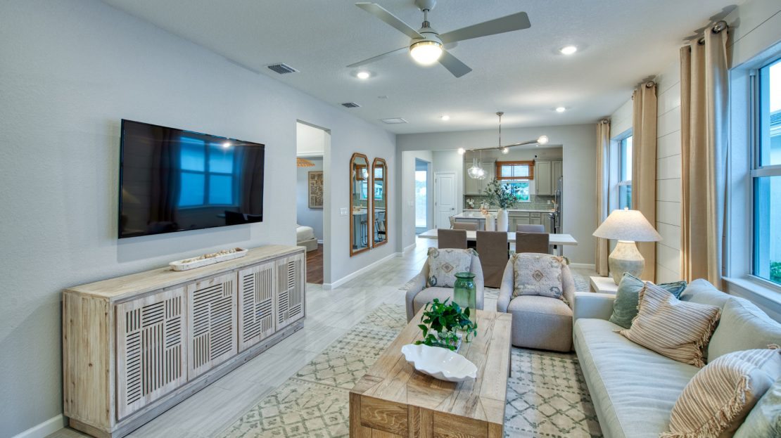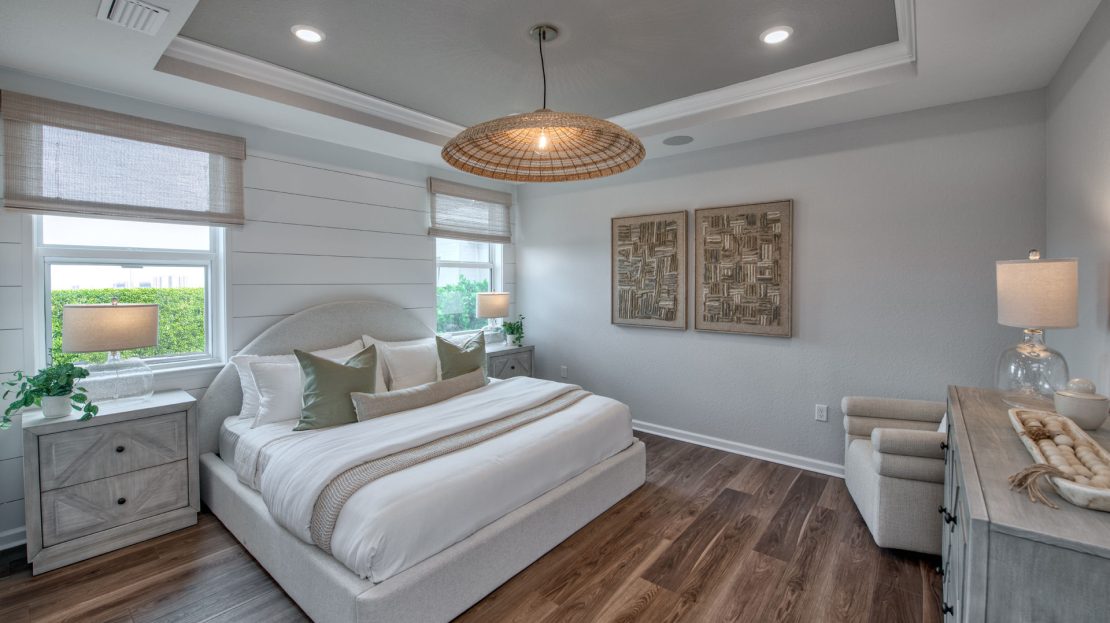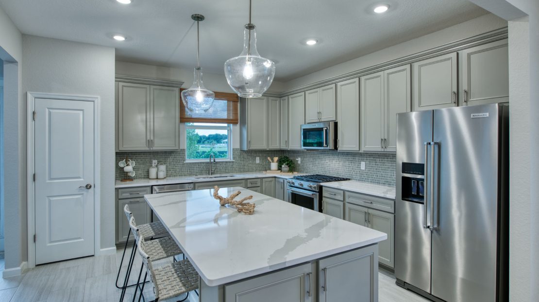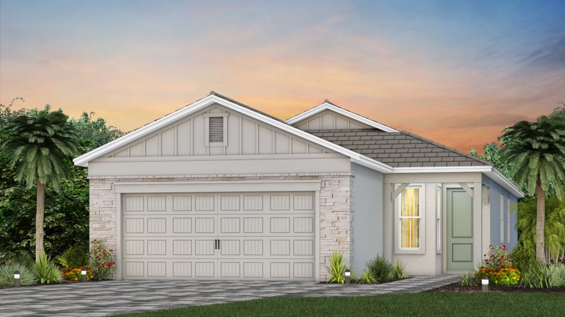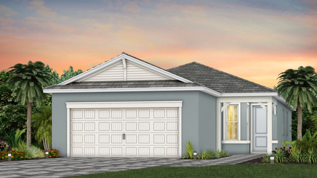 The Compass new construction home features an open layout from the foyer to the kitchen, keeping family and friends connected. Beautiful cabinetry and a large center island compliment the kitchen, while the connected café space makes dining a breeze. Add a sunroom off of the kitchen to enjoy Florida’s beautiful sunshine year-round.